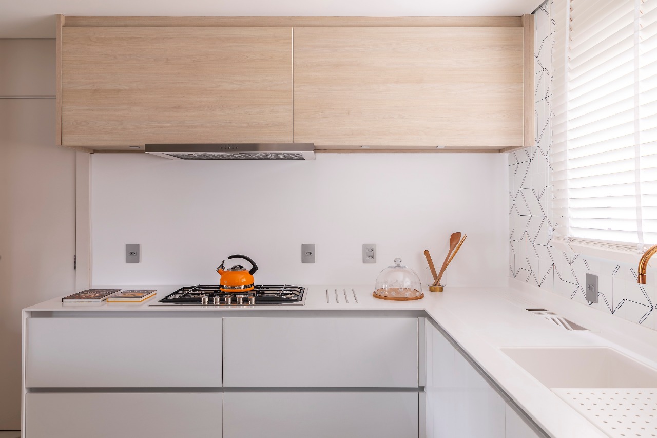 Nesta cozinha, o misturador na cor red gold da Deca se destaca em meio aos tons claros e amadeirados.