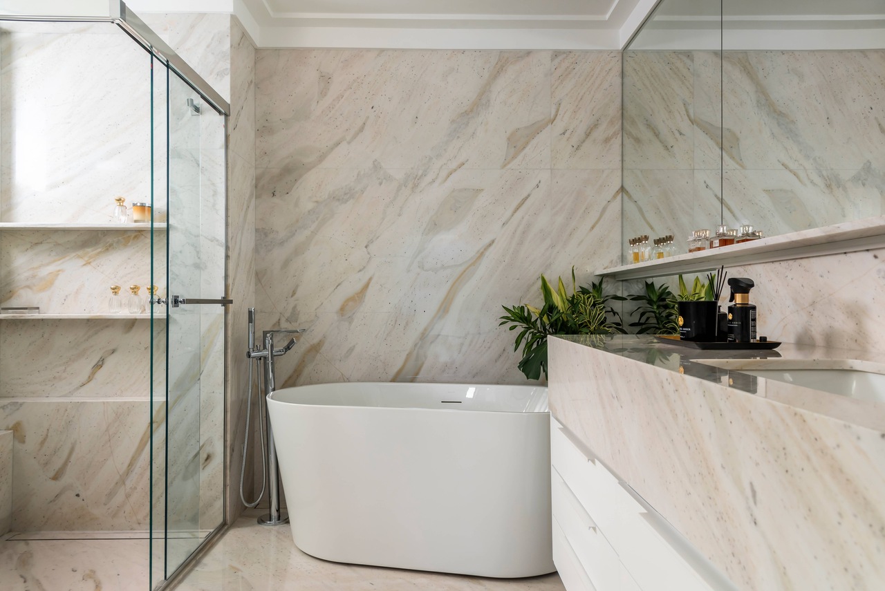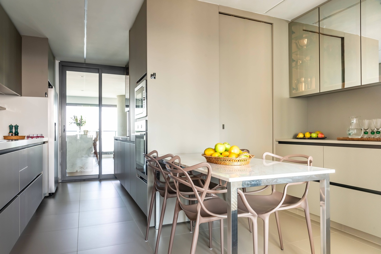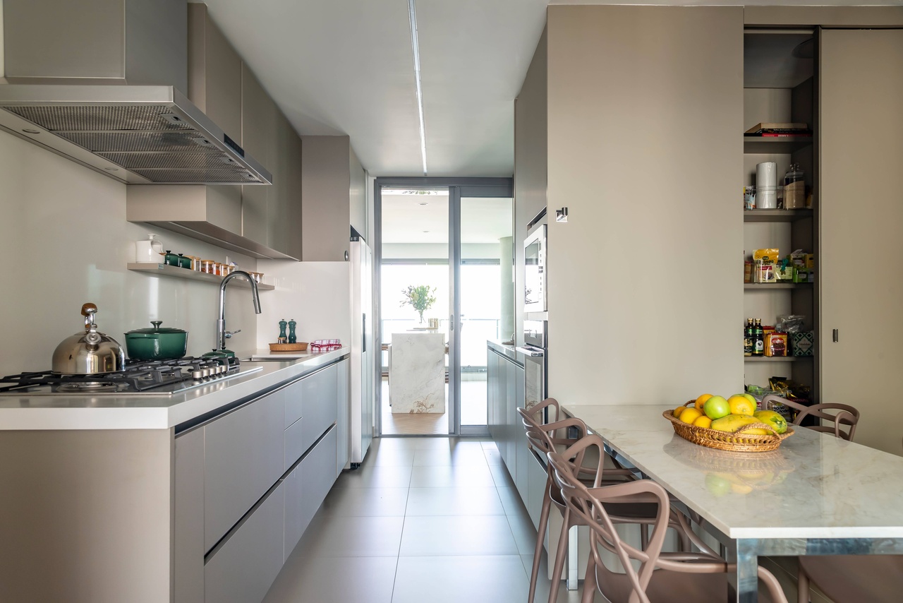 A cozinha foi projetada para unir neutralidade e máxima funcionalidade, garantindo que a dona da casa, que adora receber e possui um grande acervo de louças, tenha tudo organizado de forma prática. O mármore escolhido traz um toque natural e elegante, enquanto os vidros conferem leveza ao ambiente. Para maximizar o espaço, foram criados armários planejados em detalhes e executados sob medida pela Kitchens.