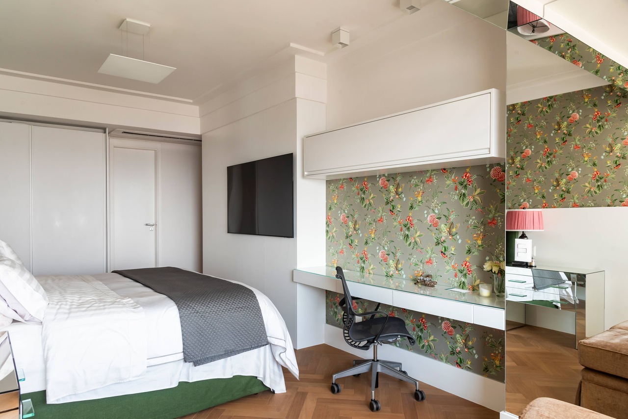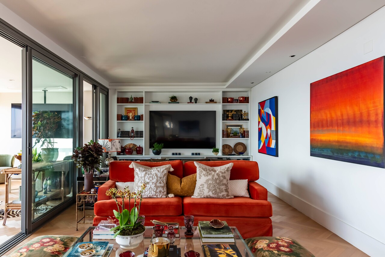 Para área social, a marcenaria branca desenhada sob medida tem um papel essencial, pois destaca cada peça do acervo da moradora. Uma ampla estante foi projetada para acomodar eletrônicos e elementos decorativos de forma equilibrada. “A iluminação é cuidadosamente planejada para criar diferentes cenários: destacando objetos em momentos especiais e proporcionando um ambiente mais intimista e relaxante quando desejado”. O espaço reflete a história da família e convida ao convívio, permitindo que cada elemento traga uma narrativa própria.