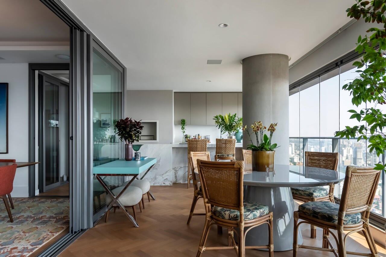 O terraço amplo foi concebido como uma extensão natural da área social, projetado para momentos de lazer e contemplação da vista deslumbrante. O piso de bambu contrasta harmoniosamente com o mármore natural, criando uma base neutra para o mobiliário. “Trouxemos um mobiliário clássico, incluindo peças do acervo da cliente e objetos que revelam histórias de viagem e de bons momentos da vida da família”.
