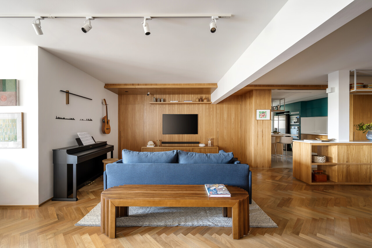Outro recurso foi a mimetização das portas do lavabo e da área íntima no painel da TV, estratégia que reforça a continuidade visual do living.