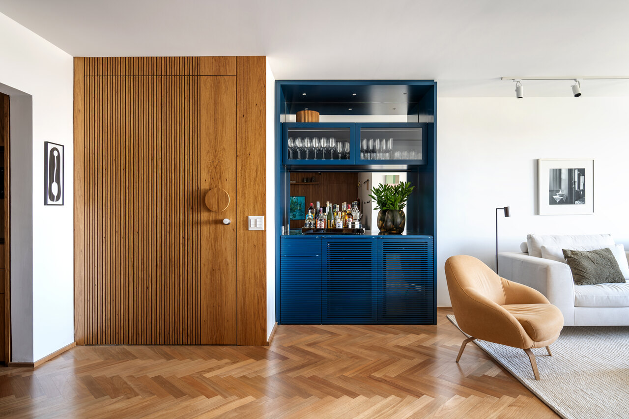 A marcenaria desempenha papel central no projeto, reunindo soluções que unem organização e estética. No living, por exemplo, o bar esconde as adegas atrás de portas ripadas, enquanto um móvel na sala de jantar reúne gavetas e compartimentos para louças, faqueiros e garrafas de vinho.