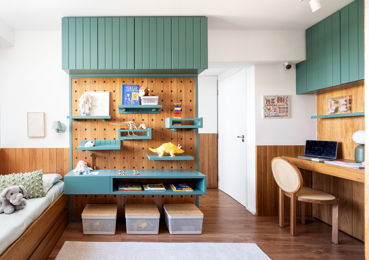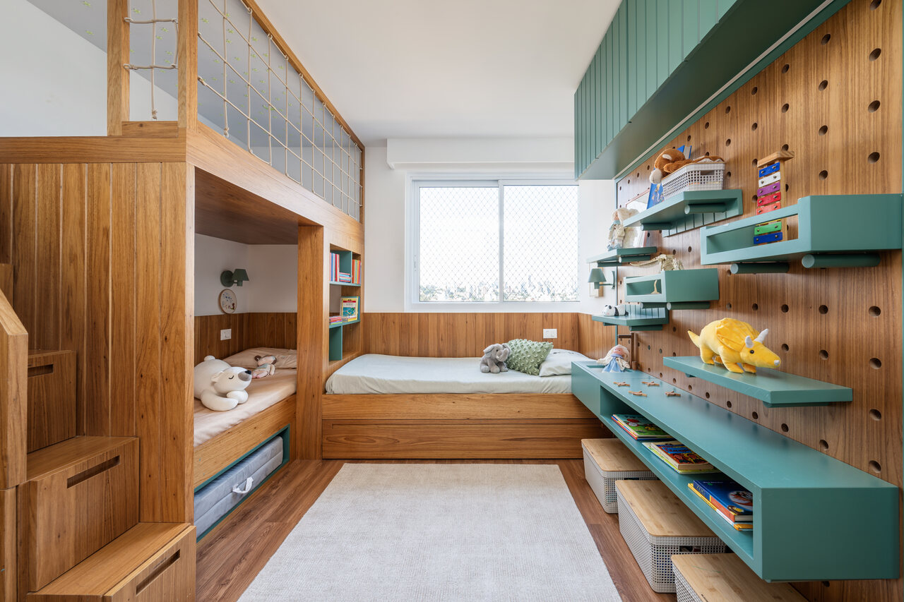 Entre os destaques estão um tablado superior, um canto de leitura e uma estante para brinquedos. Nesta última, um painel perfurado permite alterar a posição das prateleiras por meio de pinos encaixados, adaptando o móvel conforme as necessidades ao longo do tempo.