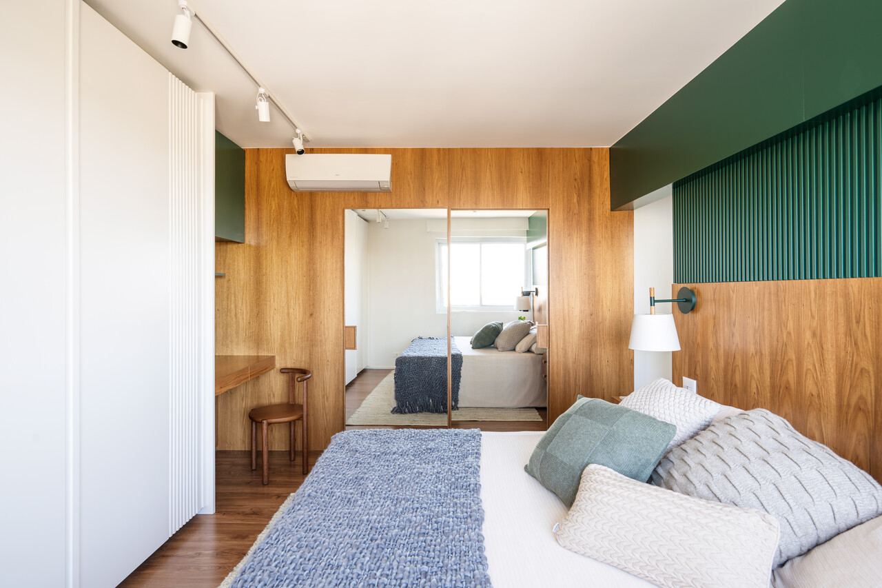 No dormitório do casal, a marcenaria novamente assume protagonismo. O painel da cabeceira combina madeira natural lisa na parte inferior com acabamento ripado e laqueado em verde na parte superior, criando textura e profundidade.