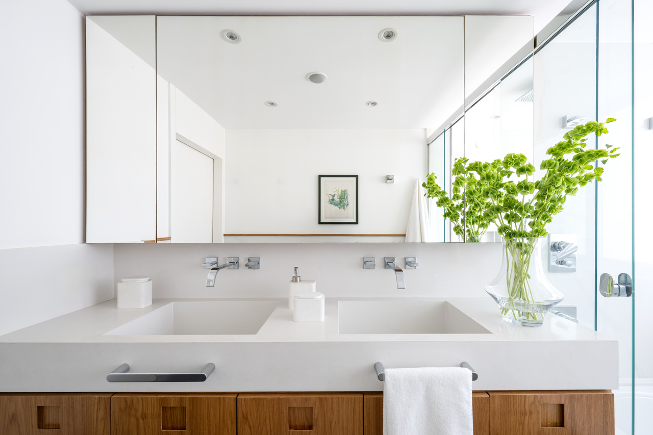 A metragem exigiu algumas adaptações no layout. Uma delas foi a redução do lavabo para permitir a criação de um novo closet. Para manter o espaço confortável, a arquiteta adotou soluções práticas, como a porta abrindo para fora.