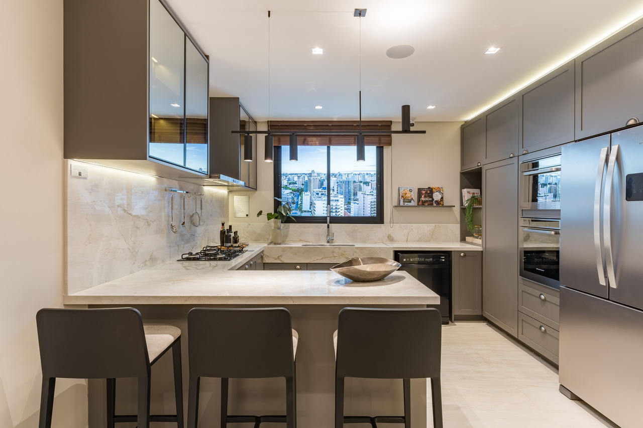 A cozinha segue a proposta de um clássico revisitado, com armários em tons acinzentados que dialogam com metais pretos, adicionando uma leitura contemporânea e sofisticada ao espaço. A composição é equilibrada, funcional e atemporal, pensada para o uso cotidiano sem perder refinamento.