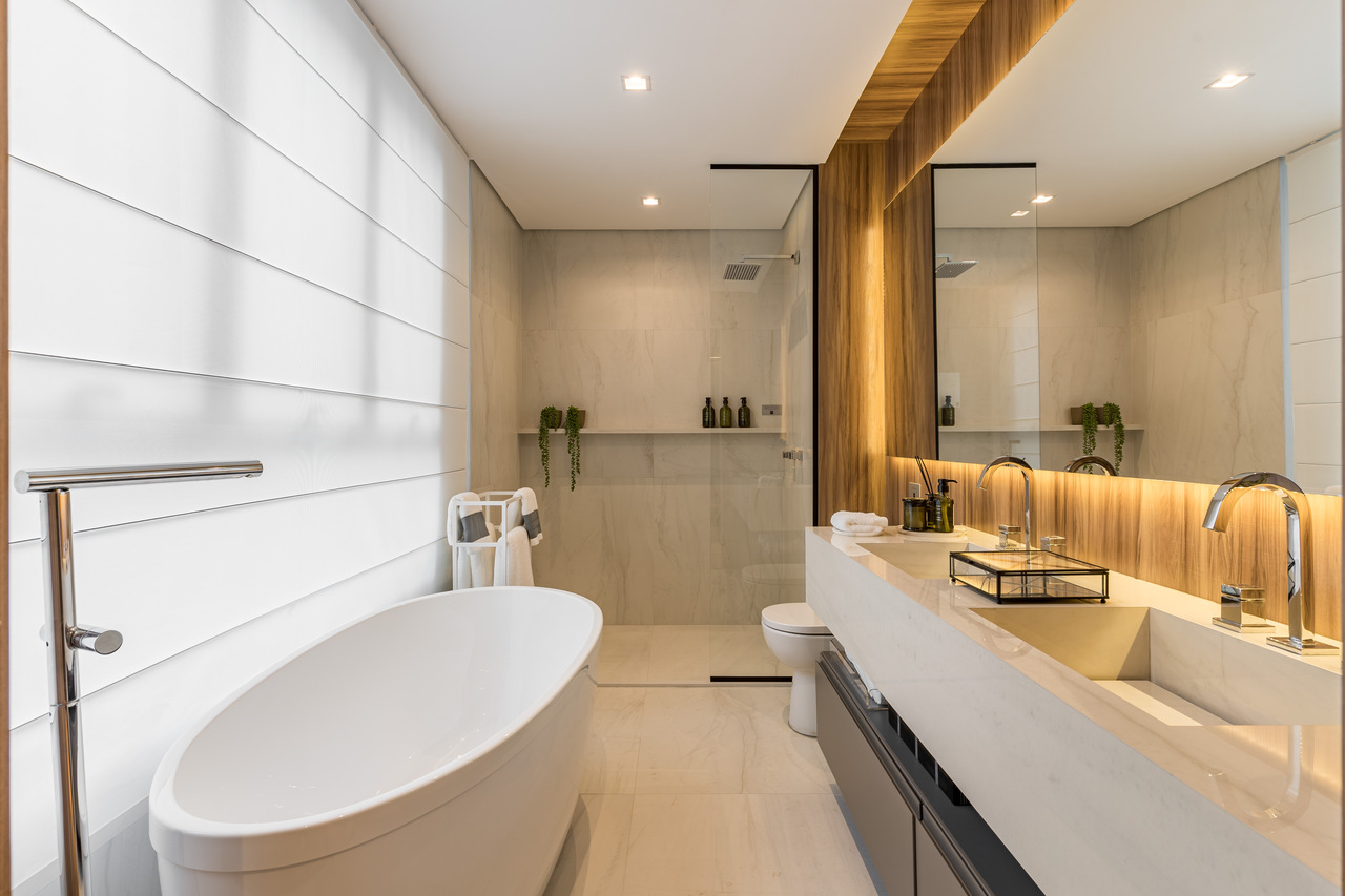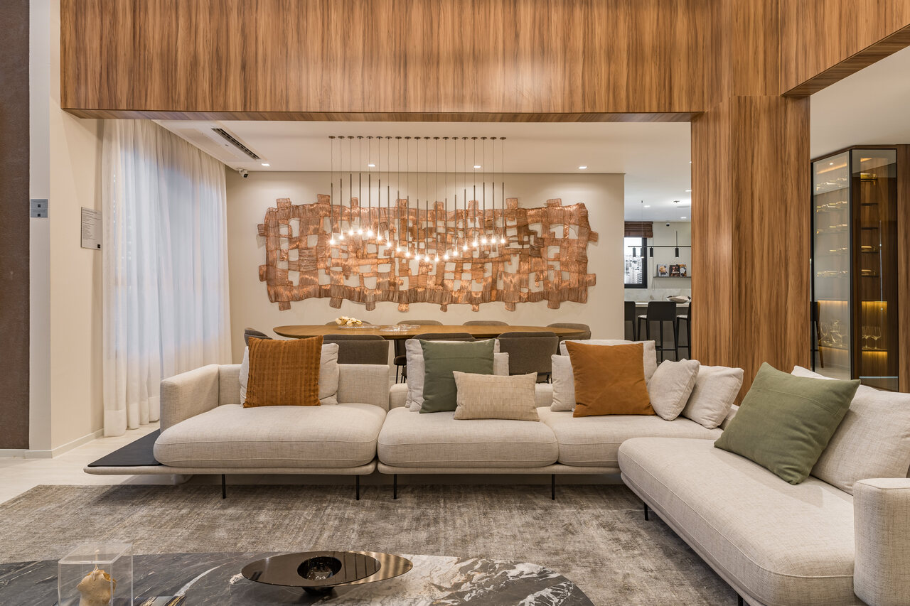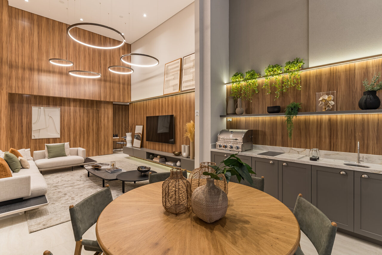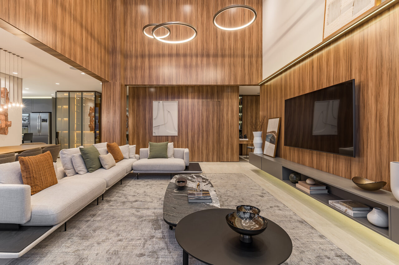Na sala de estar com pé-direito duplo, a madeira assume papel de protagonista. Aplicada em painéis e detalhes arquitetônicos, ela equilibra a amplitude do espaço com uma sensação imediata de aconchego. A iluminação, desenhada com cuidado, valoriza o mobiliário, destaca volumes e cria diferentes cenários ao longo do dia, reforçando o caráter elegante e convidativo do ambiente. O conjunto resulta em uma área social que impressiona pela escala, mas acolhe pelo detalhe — uma combinação essencial para o convívio familiar e para receber convidados.