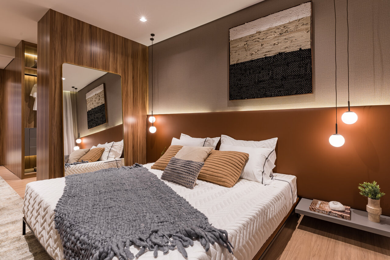 Nos dormitórios, o projeto se torna ainda mais pessoal. A suíte do casal aposta em tons terrosos e texturas naturais, criando uma atmosfera de descanso e acolhimento. No quarto infantil, a proposta é lúdica e suave, com cores delicadas e uma ambientação pensada para estimular o conforto e a imaginação.