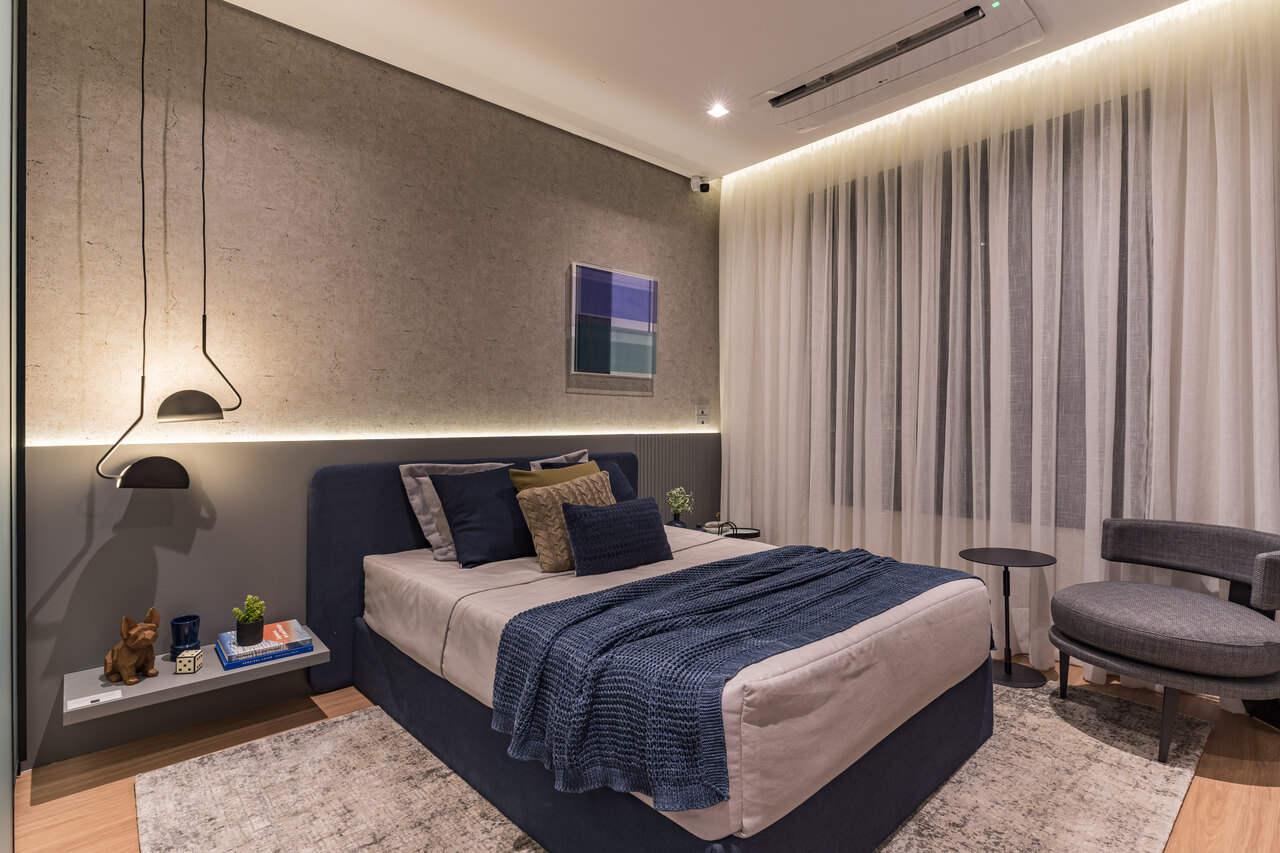 Já o quarto do pré-adolescente reflete sua identidade: uma paleta mais fria e minimalista, com destaque para os detalhes em azul e um desenho de iluminação que valoriza o espaço de forma contemporânea e funcional.