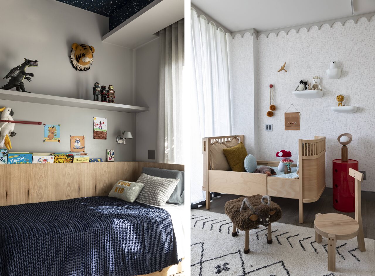 Na área íntima, cada um dos três filhos ganhou um quarto planejado para acompanhar as diferentes fases da infância e da adolescência. A proposta foi criar ambientes versáteis, capazes de se adaptar às mudanças de uso ao longo do tempo.