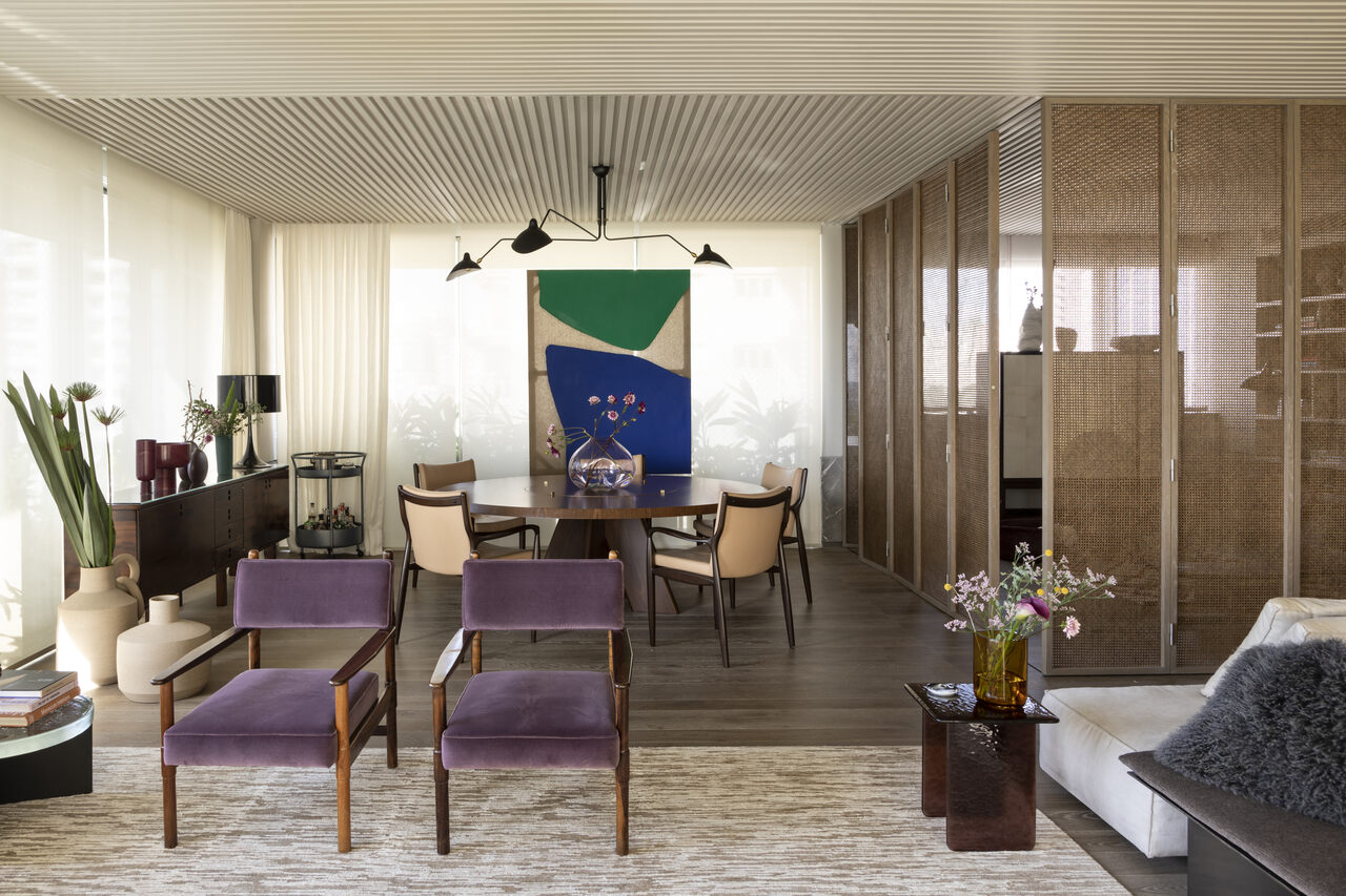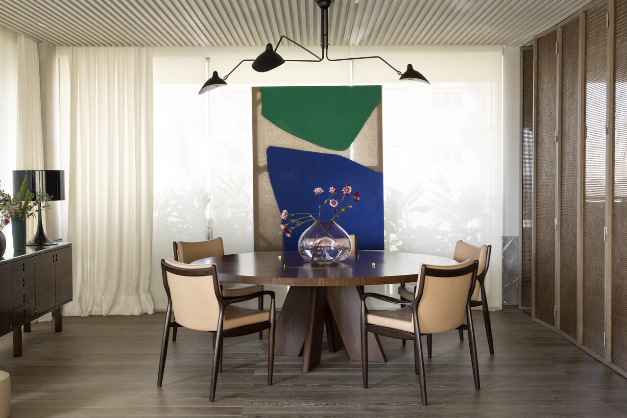 A decoração mistura referências contemporâneas e peças vintage, criando um ambiente sofisticado e cheio de personalidade. Mobiliário de design, obras de arte e objetos afetivos compõem o décor e ajudam a contar a história dos moradores.