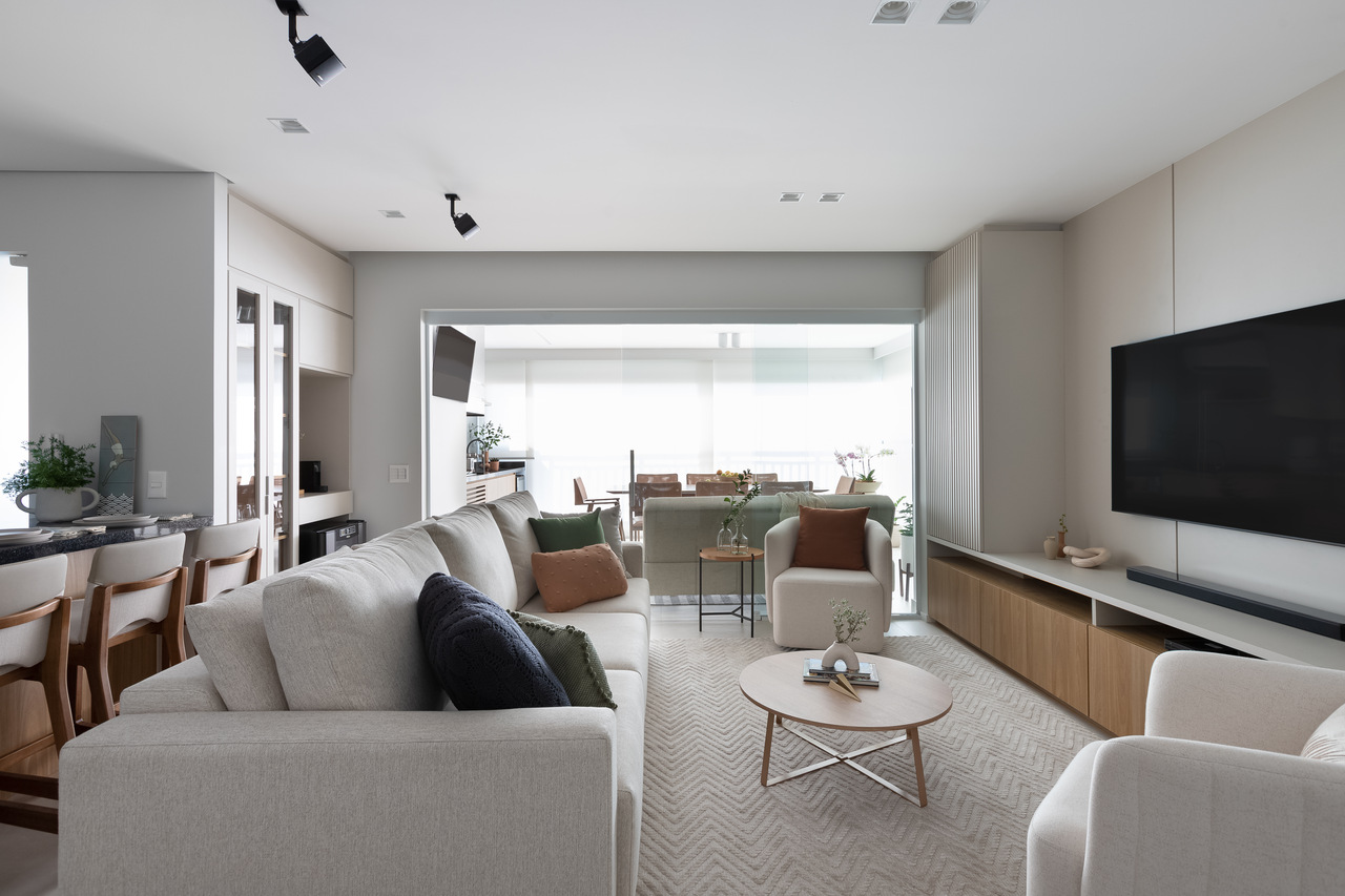A sala de estar e a varanda gourmet foram projetadas para ampliar a sensação de espaço, com um layout que facilita a circulação. A mesa de jantar para oito lugares foi posicionada próxima à churrasqueira, criando um ambiente ideal para refeições e encontros sociais. O restante do espaço foi dedicado à área de estar, que conta com um aparador e banquetas para refeições rápidas, formando um ambiente multifuncional e aconchegante.
