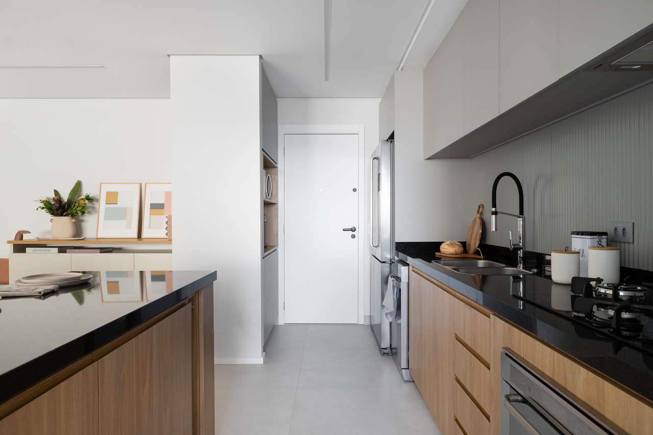 A cozinha, agora integrada à varanda gourmet, destaca-se pelos revestimentos em tons neutros de cinza e madeira Freijó, que criam continuidade e fluidez entre os espaços. Para suavizar o impacto visual do granito preto nas bancadas, a combinação de madeira e tons de cinza traz equilíbrio e leveza ao ambiente. A bancada de refeições foi reformulada, substituindo uma grande empena de pedra por um armário estreito, ideal para armazenar canecas, livros de receitas e itens decorativos, tornando o espaço mais funcional e elegante.