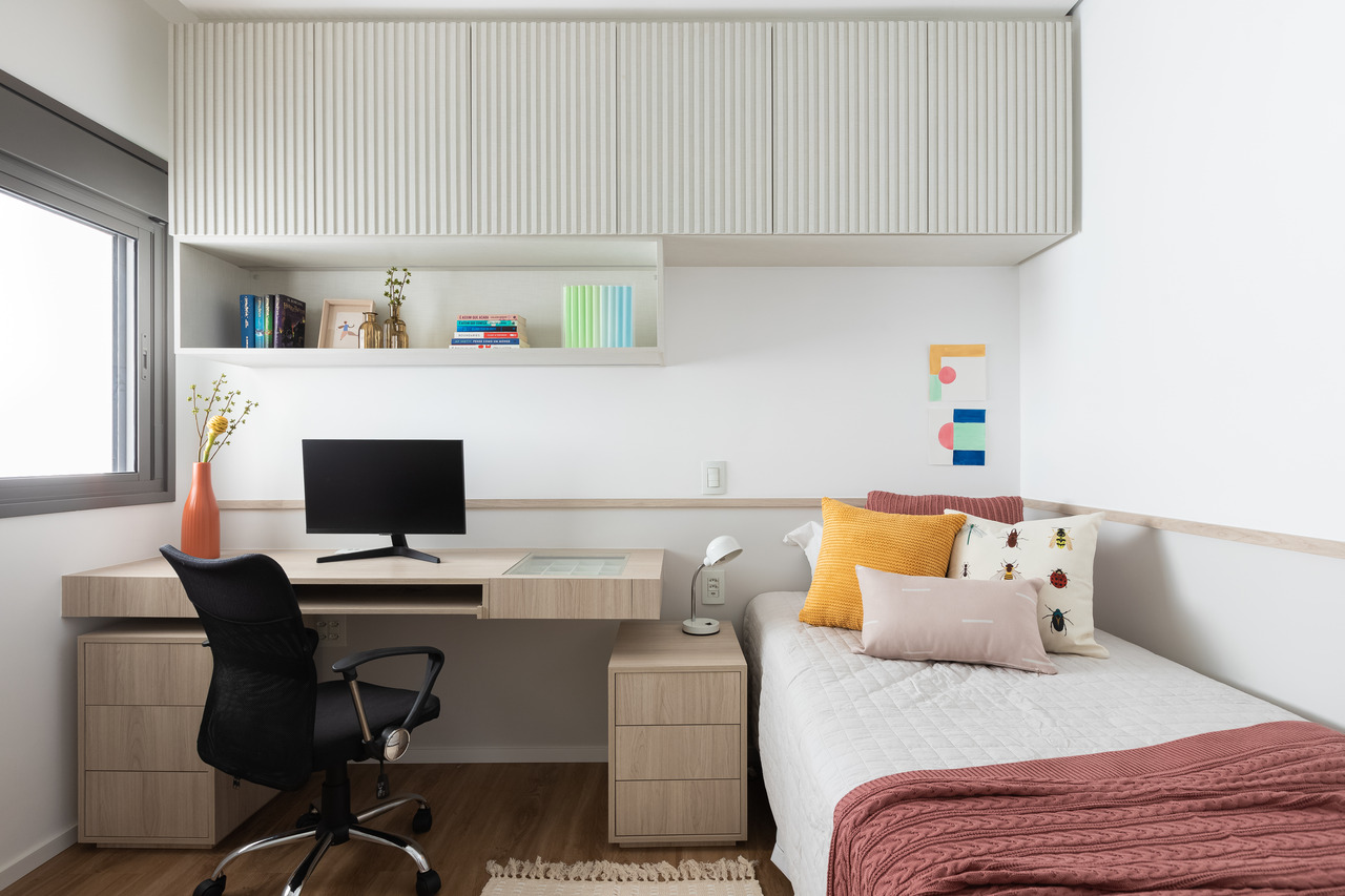 Com apenas 9m², a suíte da filha foi planejada para atender a duas funções: dormir e trabalhar. A solução de marcenaria permitiu a otimização do espaço, trazendo amplo armazenamento sem comprometer a leveza visual. A mesa de home office, que também funciona como penteadeira, e um móvel suspenso ripado foram escolhas que garantiram um ambiente prático e harmonioso.