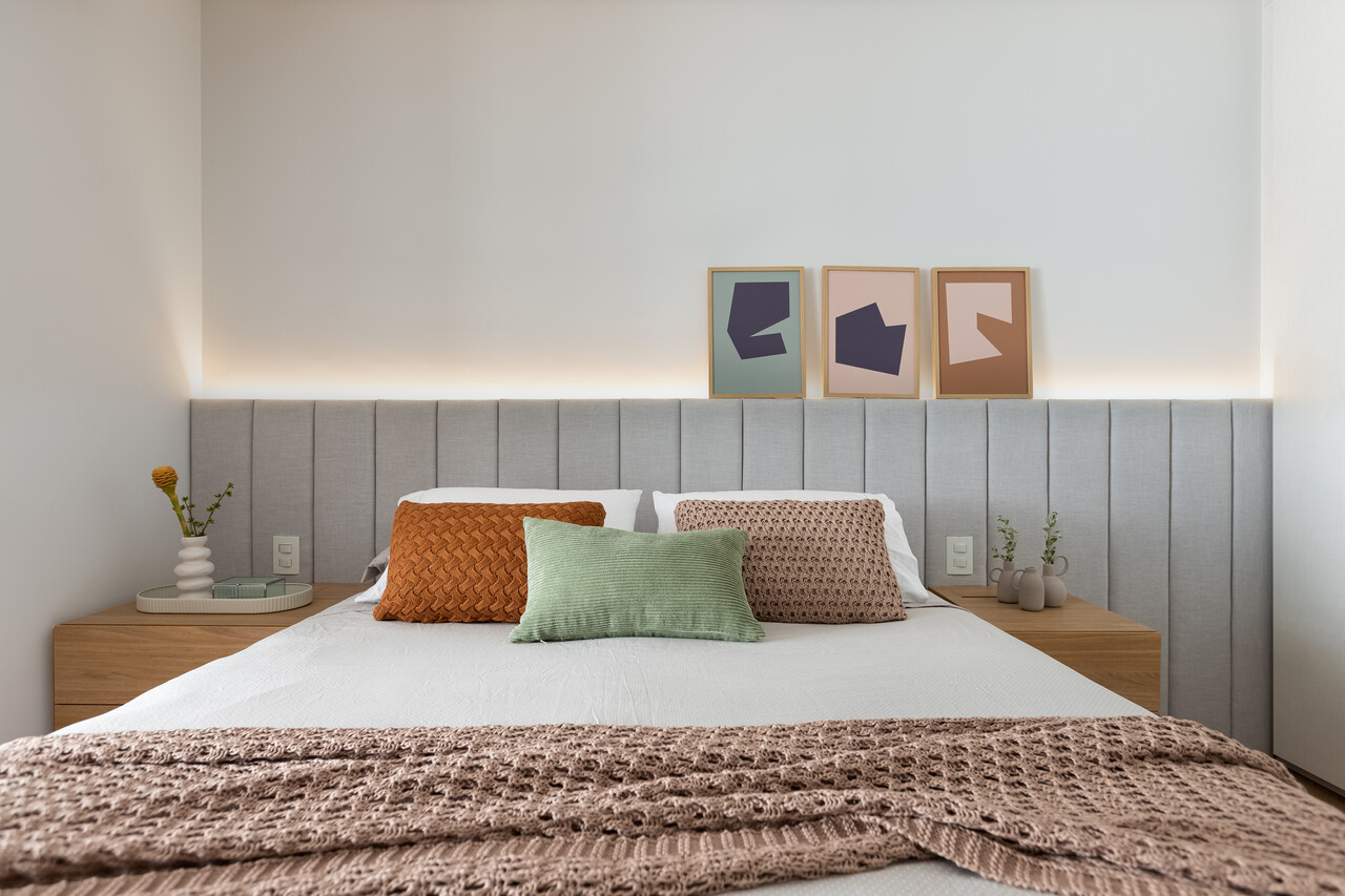 Por fim, a suíte do casal foi projetada para transmitir sofisticação e aconchego. A cabeceira estofada em gomos se tornou o ponto de partida do conceito, trazendo elegância ao ambiente. O espaço generoso permitiu a instalação de armários de alta qualidade sem comprometer a amplitude. O guarda-roupa foi revestido com MDF de textura de linho claro, e o móvel ao lado da TV recebeu portas de espelho que se integram à decoração, criando um ambiente leve e sofisticado.