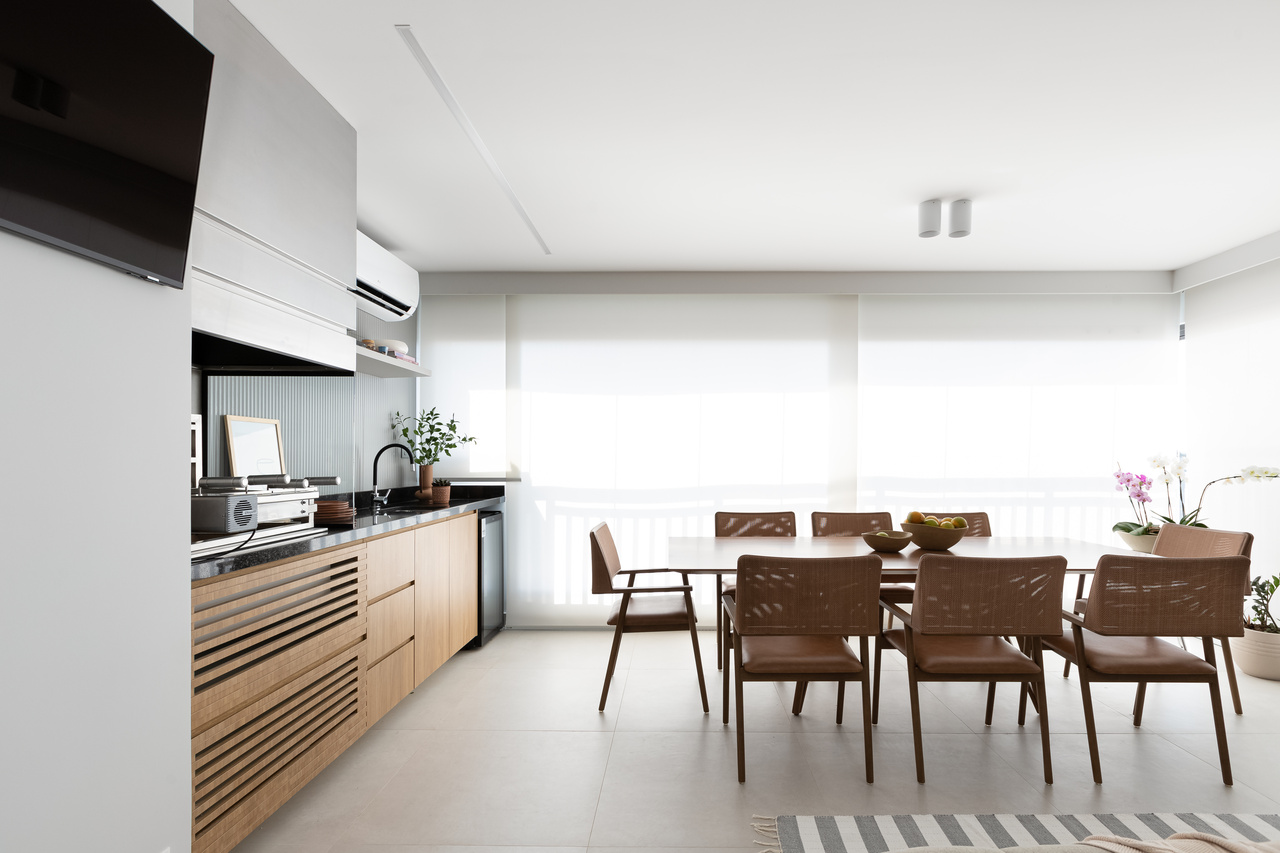 A sala de estar e a varanda gourmet foram projetadas para ampliar a sensação de espaço, com um layout que facilita a circulação. A mesa de jantar para oito lugares foi posicionada próxima à churrasqueira, criando um ambiente ideal para refeições e encontros sociais. O restante do espaço foi dedicado à área de estar, que conta com um aparador e banquetas para refeições rápidas, formando um ambiente multifuncional e aconchegante.