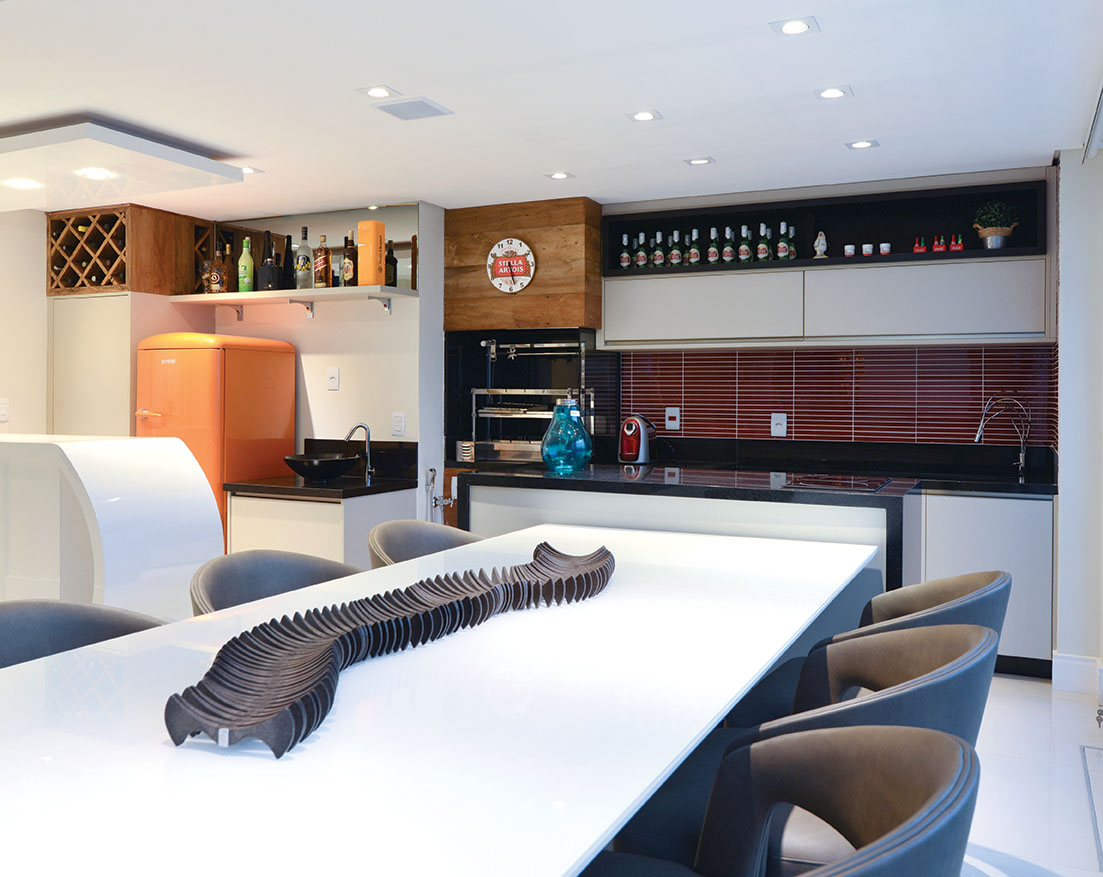 Para atender o hábito do bem receber, o escritório teve foco especial na área social. A começar pela varanda gourmet, pontuada pelo vermelho, a cor preferida da proprietária, e bem equipada –  churrasqueira e um bar, além de uma clássica geladeira laranja. Ligada a esse ambiente, o estar é onde a família se reúne para assistir à TV. A entrada do apartamento, portanto, foi mudada de posição para aumentar o espaço, criando um hall interno. Um grande móvel para a TV se junta ao aquário de madeira de demolição – para lembrar os animais que a família criava na outra casa – e, com a parede maior, foi possível utilizar um grande e confortável sofá de veludo. Para dar uniformidade à área social, os designers optaram por porcelanato e paredes claros. “É sempre bom ter bases neutras para ressaltar móveis e objetos”, analisam.