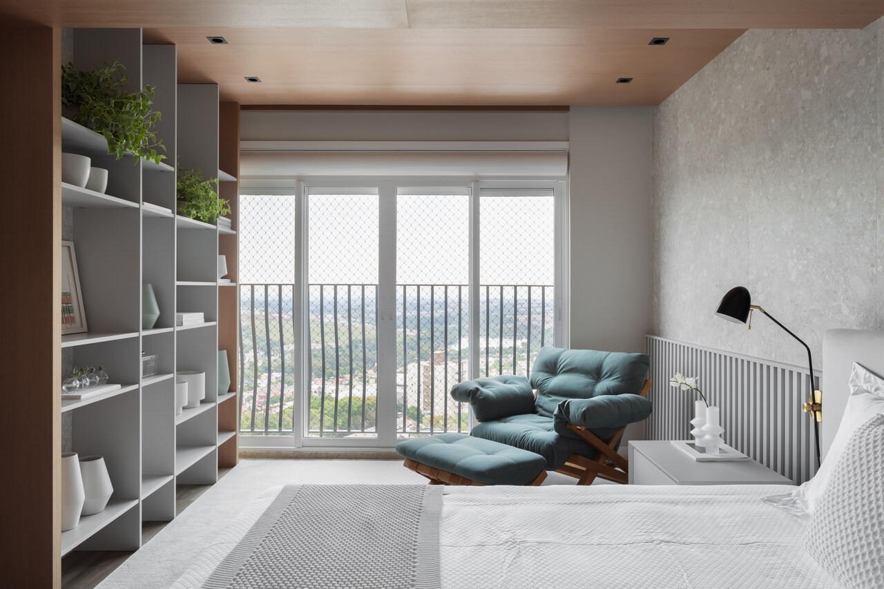 Já no living, destaque para a estante, que teve uma curadoria de obras de arte e objetos em cerâmica compondo a proposta de um ambiente convidativo e de contemplação.