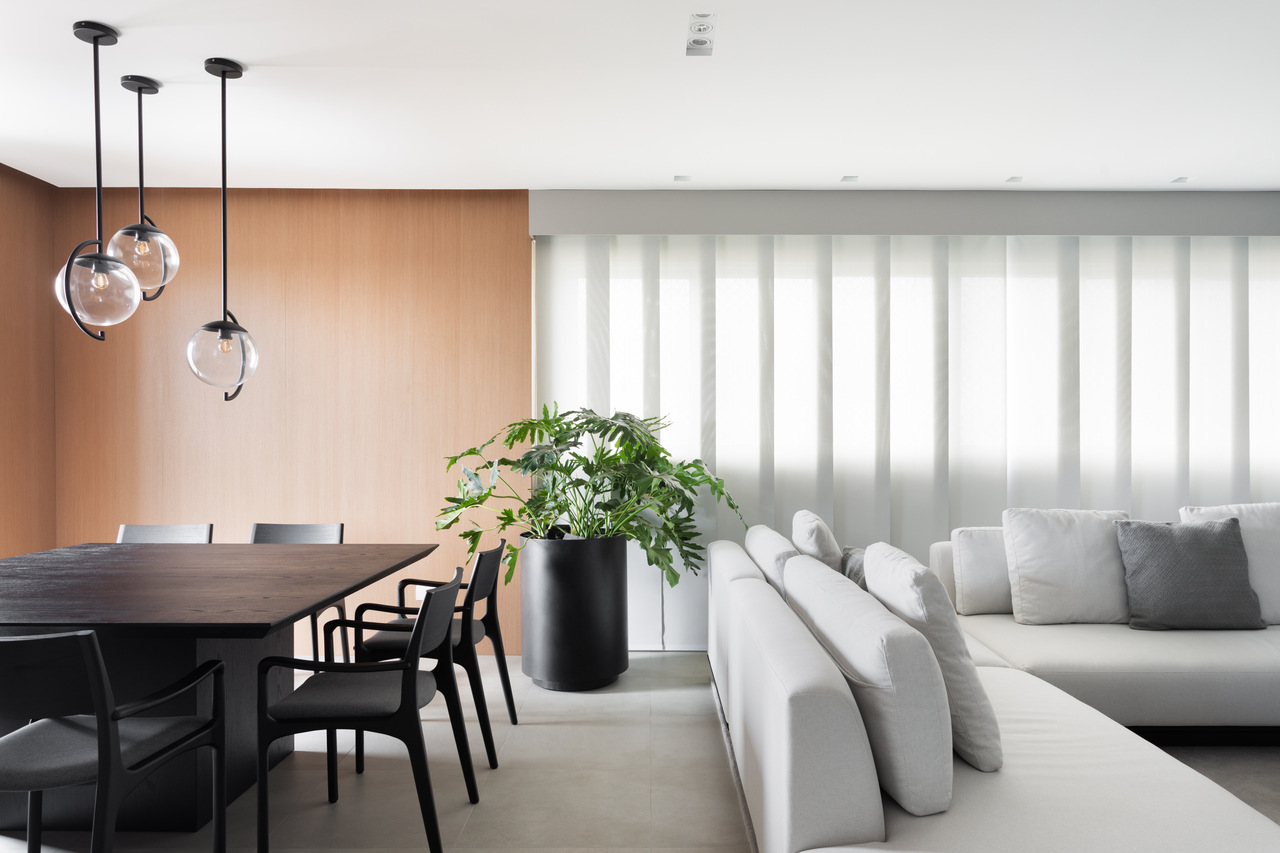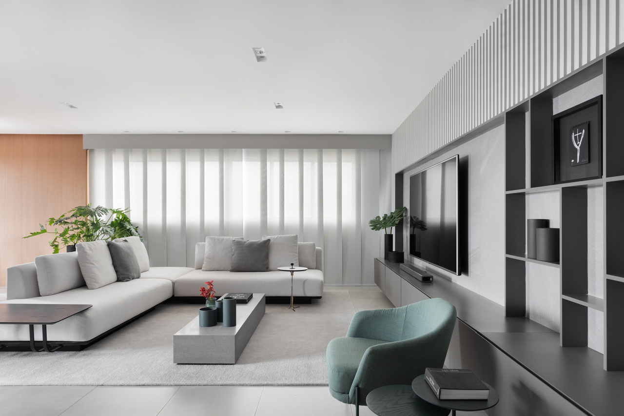 Projetado para um jovem casal, sem filhos, que gosta muito de receber amigos e familiares, o apartamento de 217 m², assinado pelo escritório de arquitetura e interiores Archi.lab traz uma paleta de tons de cinza e detalhes em preto, que ressaltam a beleza do verde e do natural, presente em tecidos, objetos, mobiliários e plantas que compõem o paisagismo.