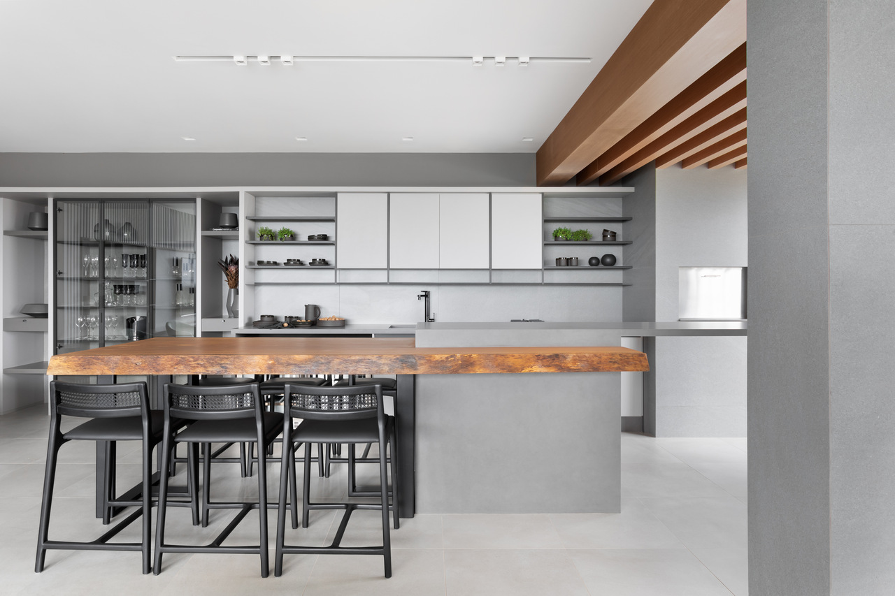 Outro ponto alto do projeto está na área gourmet, com bancada em ilha para um receber dinâmico e totalmente integrado ao living. A bancada em madeira maciça foi um pedido especial do cliente e se integrou aos tons neutros da paleta base do apartamento.