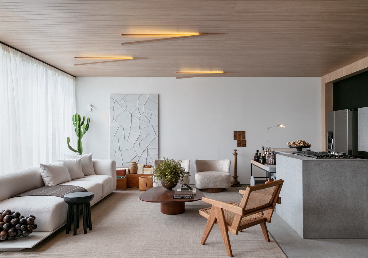 Em conceito aberto, o social integra o estar, jantar e a cozinha propondo um diálogo cativante entre funcionalidade, design e arte. Logo na entrada, uma estante de serralheria é constituída por livros, vasos e pequenos quadros distribuídos nas prateleiras, sem chamar muito a atenção. Ao lado, a icônica poltrona Chifruda, autêntica representação do clássico/contemporâneo desenhado por Sergio Rodrigues, é um legítimo convite à contemplação.