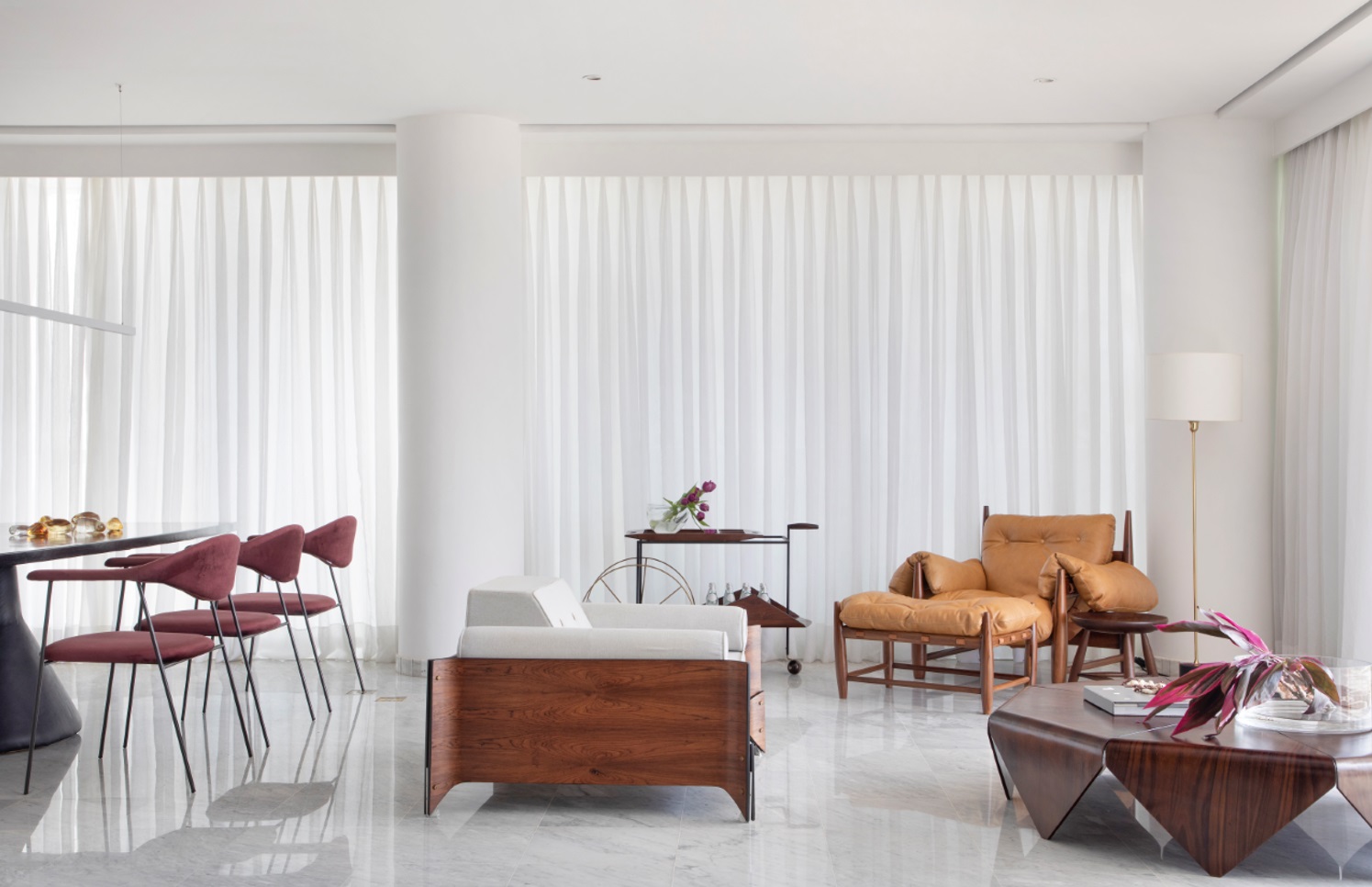 O coração do apartamento LF Bristol pulsa na sala de estar. O espaço se revela como um verdadeiro museu vivo do design brasileiro, onde cada elemento conta uma história. A base do ambiente é composta por tons claros e delicados — paredes, piso, teto e cortinas em nuances suaves que criam uma tela neutra e luminosa. Sobre esse fundo, os mobiliários ganham protagonismo, principalmente os objetos de antiquário cuidadosamente garimpados pelo casal Fernando e Letizia.