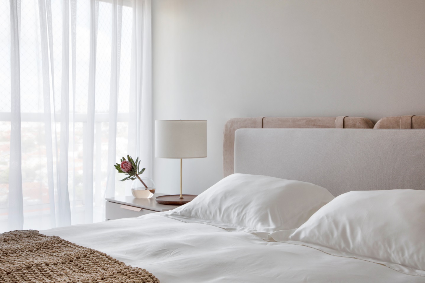 A cama, inteiramente revestida em tapeçaria em tons neutros, é um convite ao descanso. Cabeceiras e tecidos são sobrepostos sutilmente, criando um contraste delicado. As mesas de cabeceira seguem a mesma paleta de cores, garantindo uma harmonia visual que permite ao casal se desconectar da agitação cotidiana.