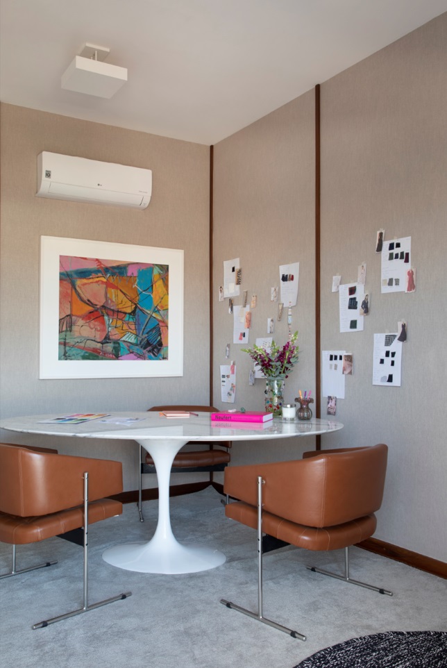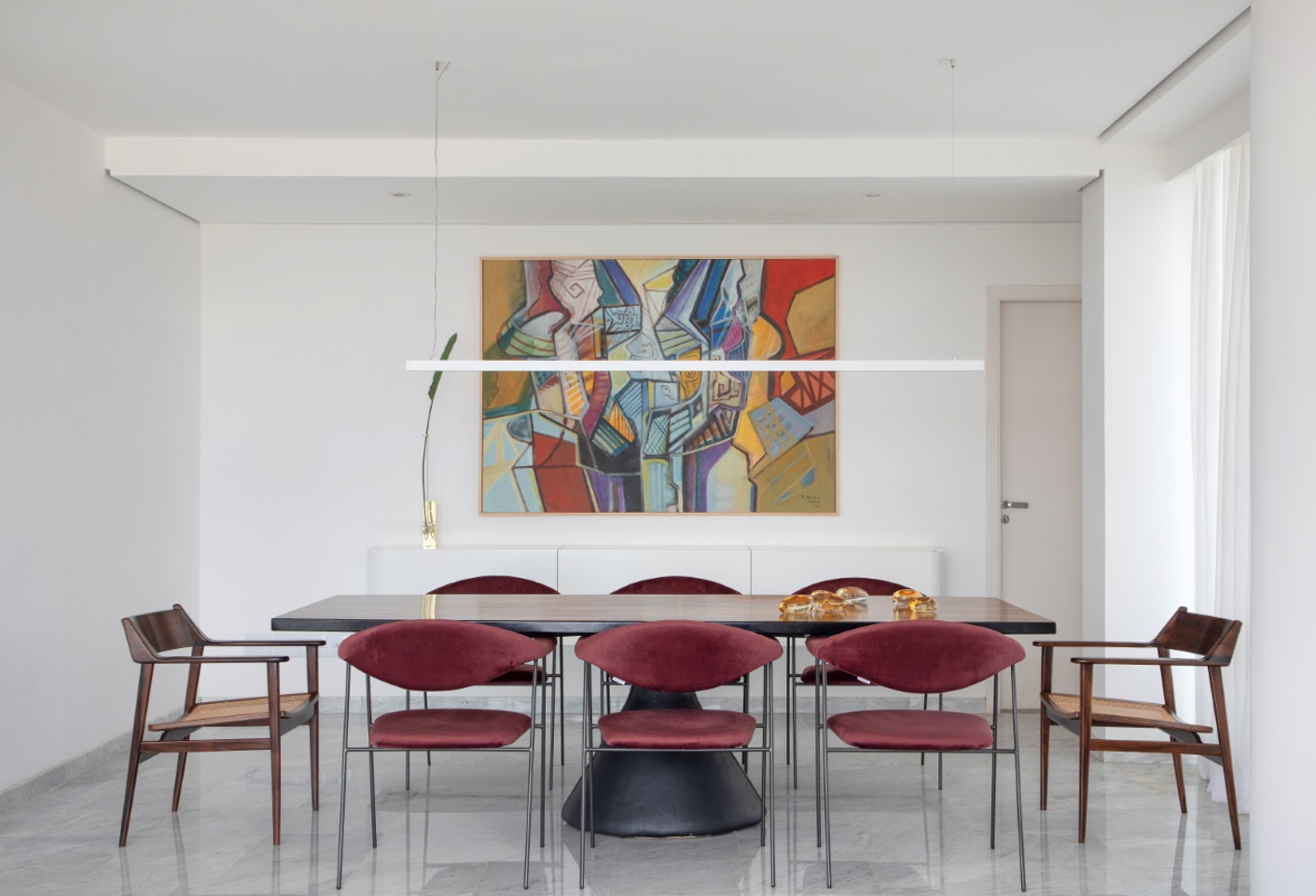 Na área de jantar, a obra de Roberto Burle Marx surge como elemento central, harmonizando-se com as cadeiras, Agda de Zanine de Zanine. As ponteiras em madeira e palha de Sérgio Rodrigues, dispostas ao lado da mesa Guanabara de Zalszupin, completam este cenário de design brasileiro.