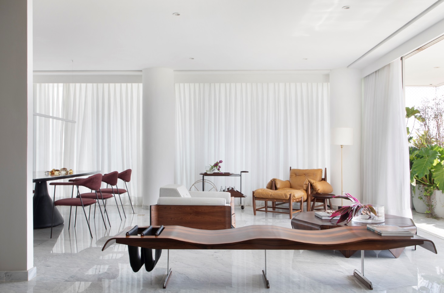O coração do apartamento LF Bristol pulsa na sala de estar. O espaço se revela como um verdadeiro museu vivo do design brasileiro, onde cada elemento conta uma história. A base do ambiente é composta por tons claros e delicados — paredes, piso, teto e cortinas em nuances suaves que criam uma tela neutra e luminosa. Sobre esse fundo, os mobiliários ganham protagonismo, principalmente os objetos de antiquário cuidadosamente garimpados pelo casal Fernando e Letizia.