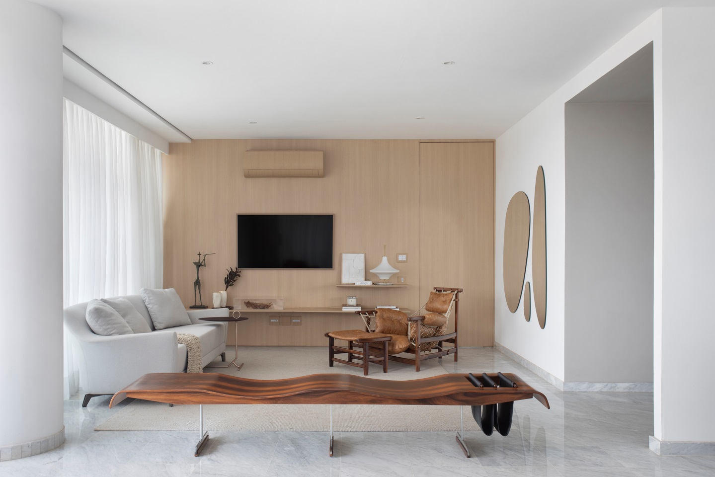 A sala se divide em dois ambientes distintos, conectados de forma orgânica. O primeiro, mais tradicional, apresenta um arranjo clássico com sofá e poltrona, pontuado por um painel ao fundo que separa discretamente a área de TV da sala de jantar. A conexão entre os espaços acontece através do icônico Banco Onda de Zalszupin, peça que funciona como elemento de transição. O segundo ambiente se caracteriza pela contemplação, abrindo-se generosamente para a vista da cidade. Um convite ao descanso e à reflexão, onde a arquitetura se funde com a paisagem urbana.