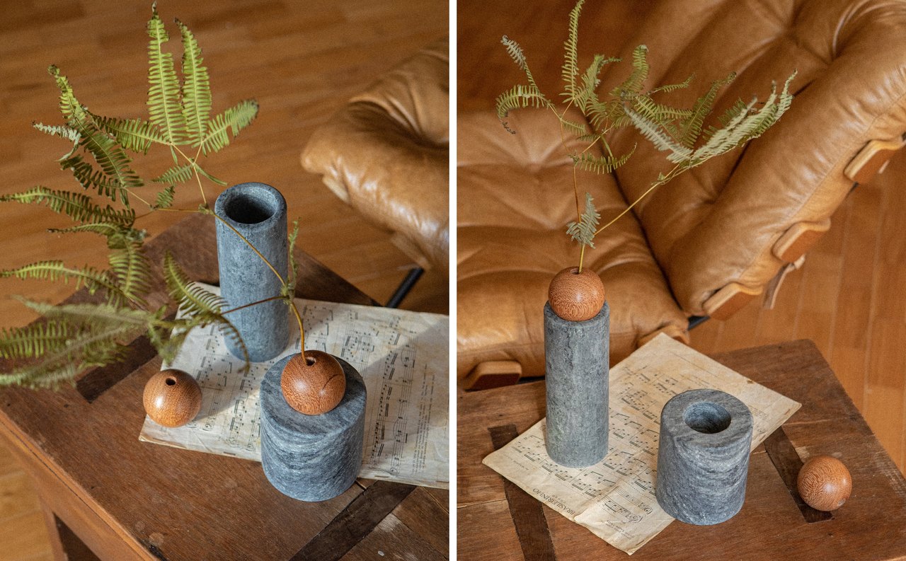 Multifuncional, como boa parte das criações da designer, o vaso é composto por peças de tamanhos variados que se desfragmentam, formando um duo versátil e delicado: com a esfera de madeira, se transforma em vaso solitário, e sem ela, está pronto para receber um arranjo maior.