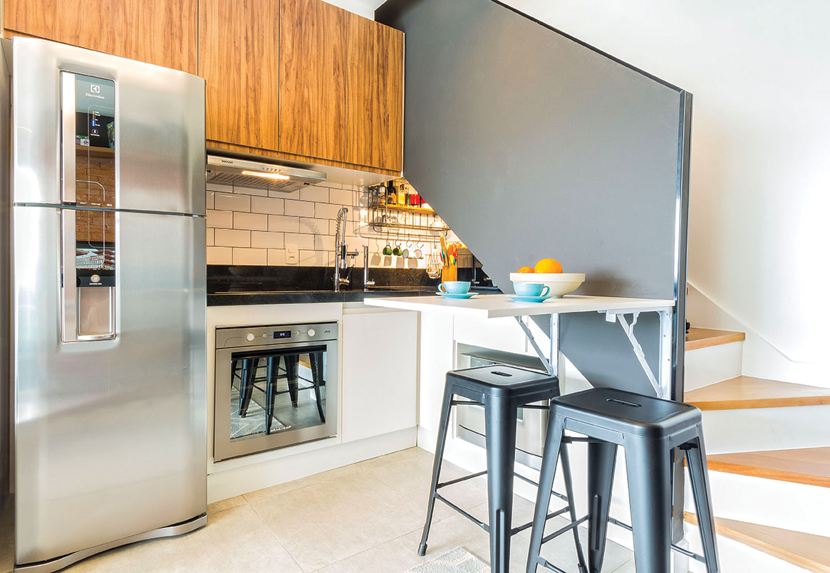 Lívia Dalmaso e Duda Senna criaram um espaço gourmet completo, vide foto acima em destaque,  no segundo andar do dúplex de 90 m², em Pinheiros, por isso era necessário projetar uma cozinha menor e mais acessível no primeiro andar, para as refeições diárias. Assim, as arquitetas aproveitaram o espaço embaixo da escada, geralmente esquecido, e montaram uma cozinha de 3,5m² com um projeto de marcenaria sob medida. O cômodo é completo, com espaços para geladeira, cooktop, forno elétrico, micro-ondas, máquina de lavar louça e mesa retrátil.