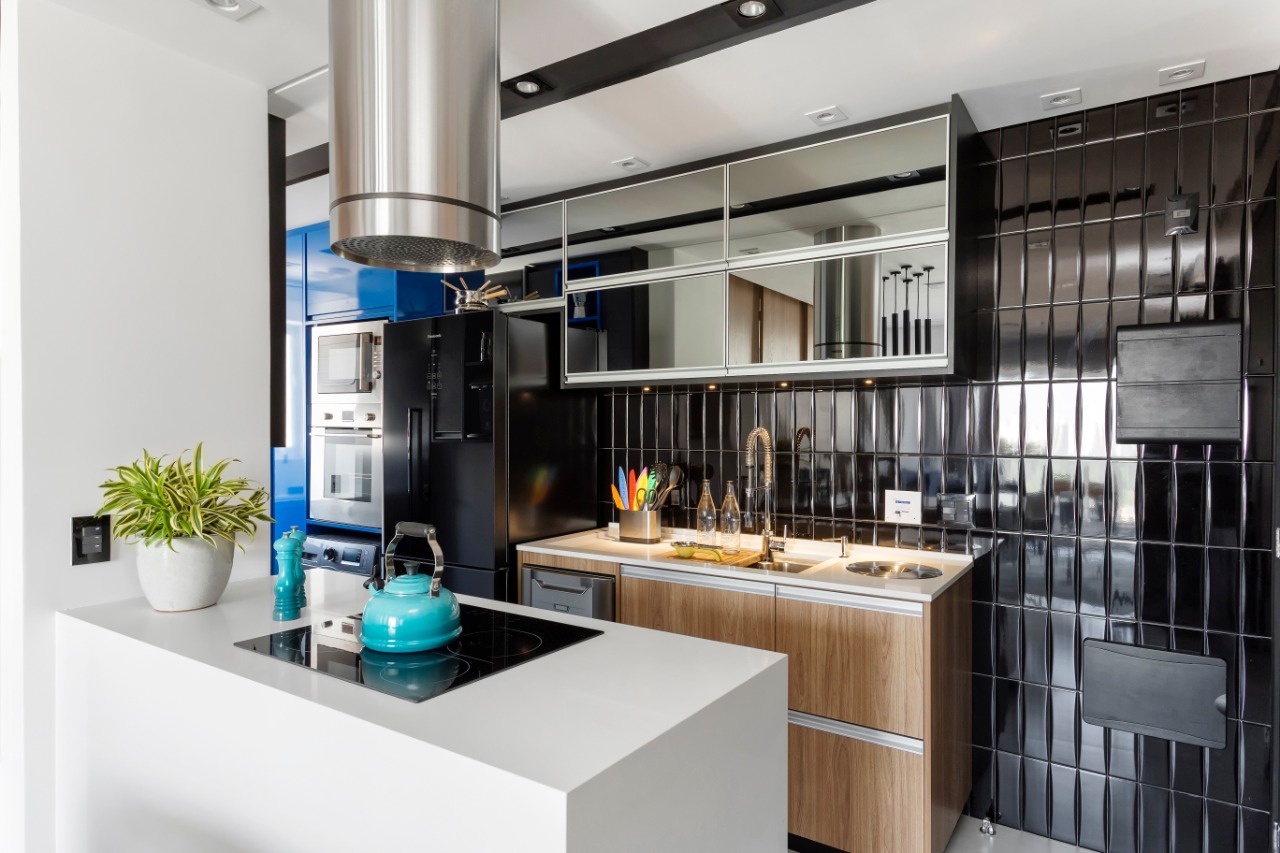 Com tons neutros, esta cozinha mostra funcionalidade e sofisticação. O espelho cria a sensação de amplitude no espaço.