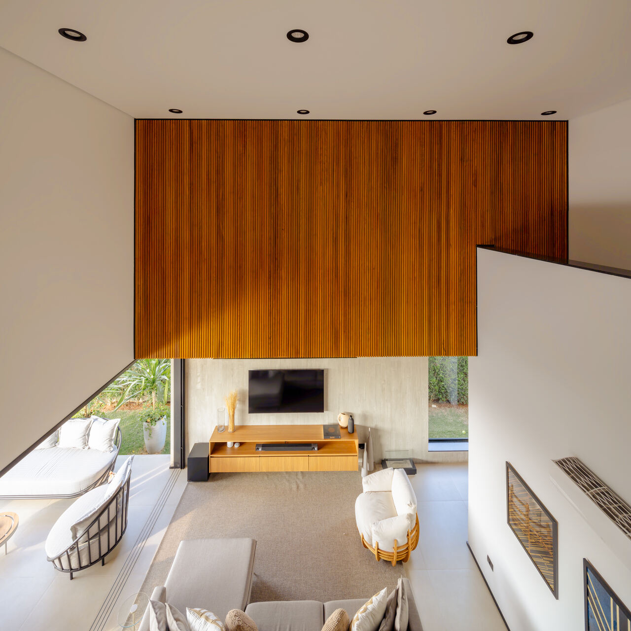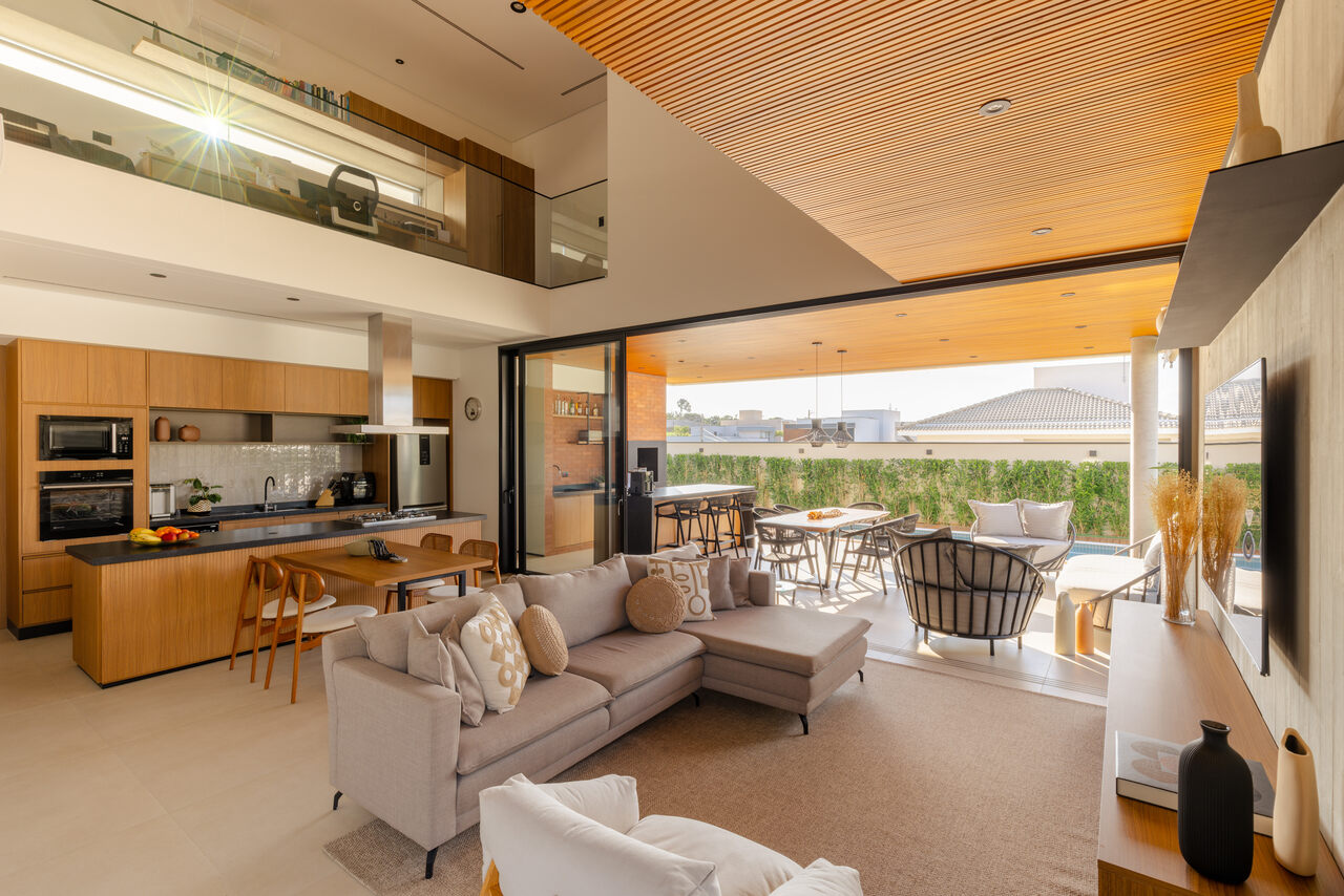 O living com pé-direito duplo conecta visual e espacialmente os dois pavimentos, favorecendo o diálogo entre os ambientes e o dia a dia da família — exatamente como propõe a essência do projeto.