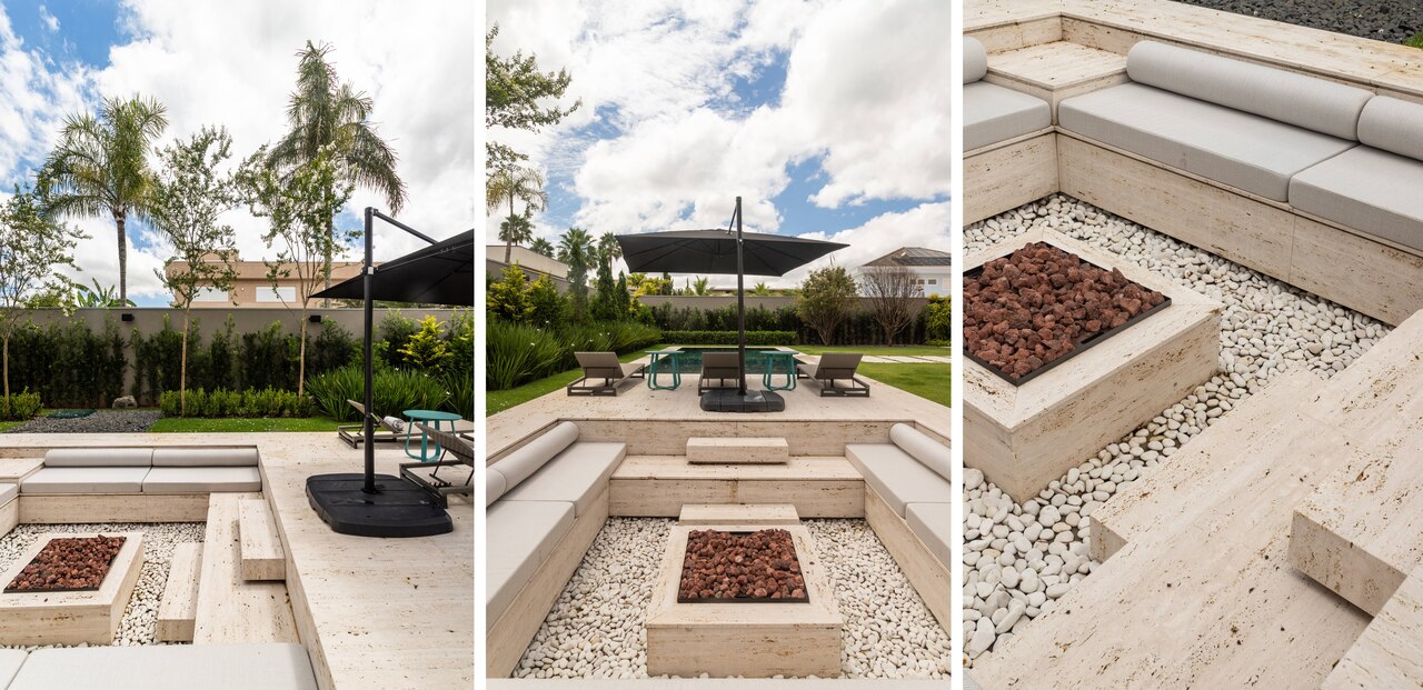 Uma lareira a gás fica posicionada no centro do conjunto de bancos revestidos em mármore Travertino Navona. Para os estofados, o tecido e o material de sua composição são próprios para ambientes outdoor, sendo resistentes à chuva e ao sol, e de uma textura extremamente similar ao do algodão