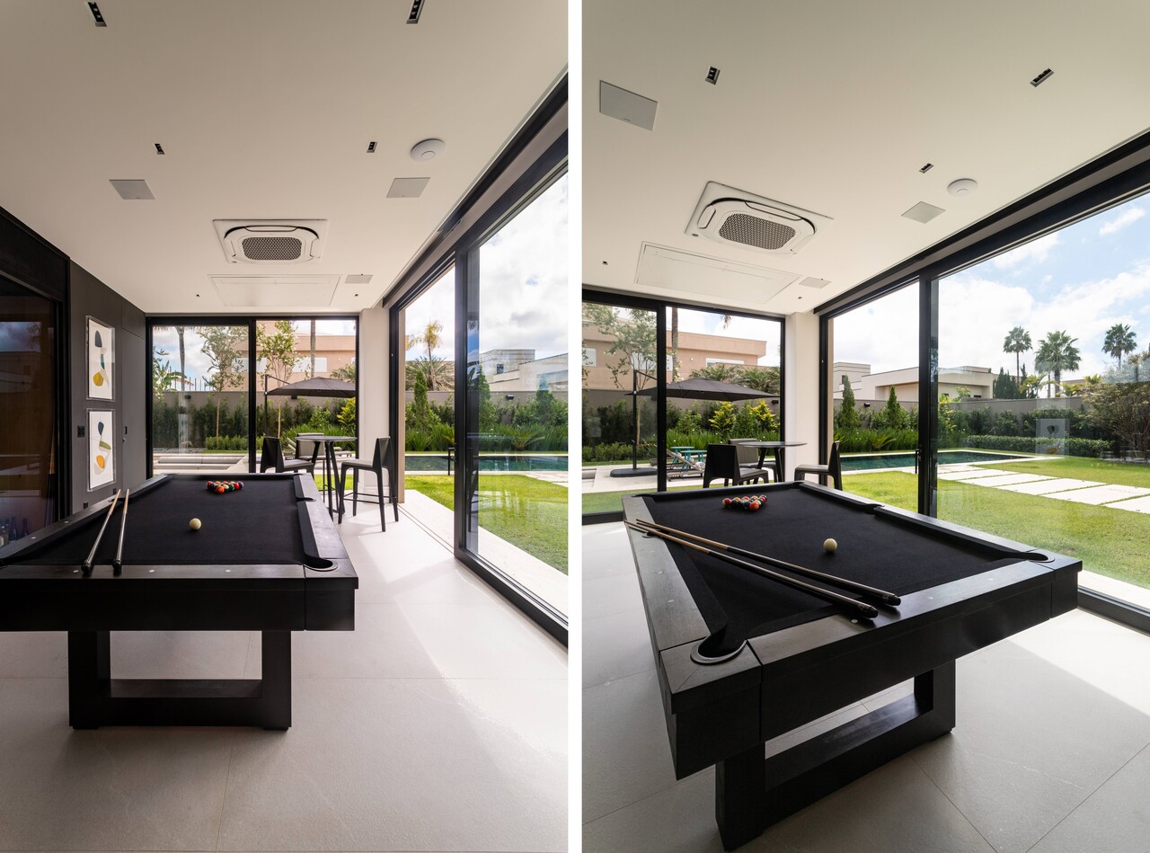 Além da mesa de bilhar em uma saleta próxima do living e a área externa, a mesa bistrô favorece o apoio de aperitivos e bebidas durante as partidas