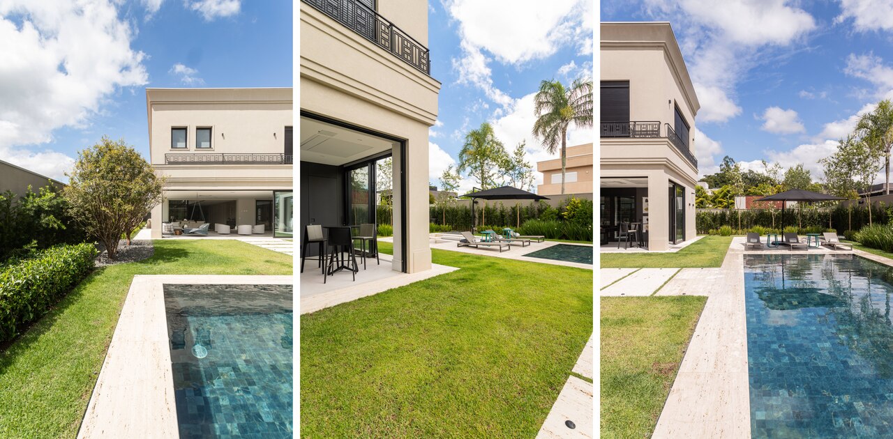 Área de lazer com piscina e o projeto de arquitetura que explora o pé-direito duplo na área social são alguns dos destaques da residência com 900 m²