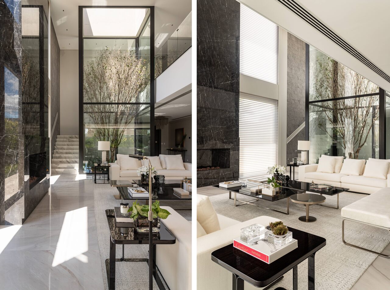 A acolhida receptiva é sentida desde o magnífico hall de entrada e o estar com as generosas janelas que exploram do pé-direito duplo, uma lareira para os dias de baixas temperaturas, o jardim de inverno que transportou uma jabuticabeira para dentro de casa e a escada que conduz para as áreas privativas da casa