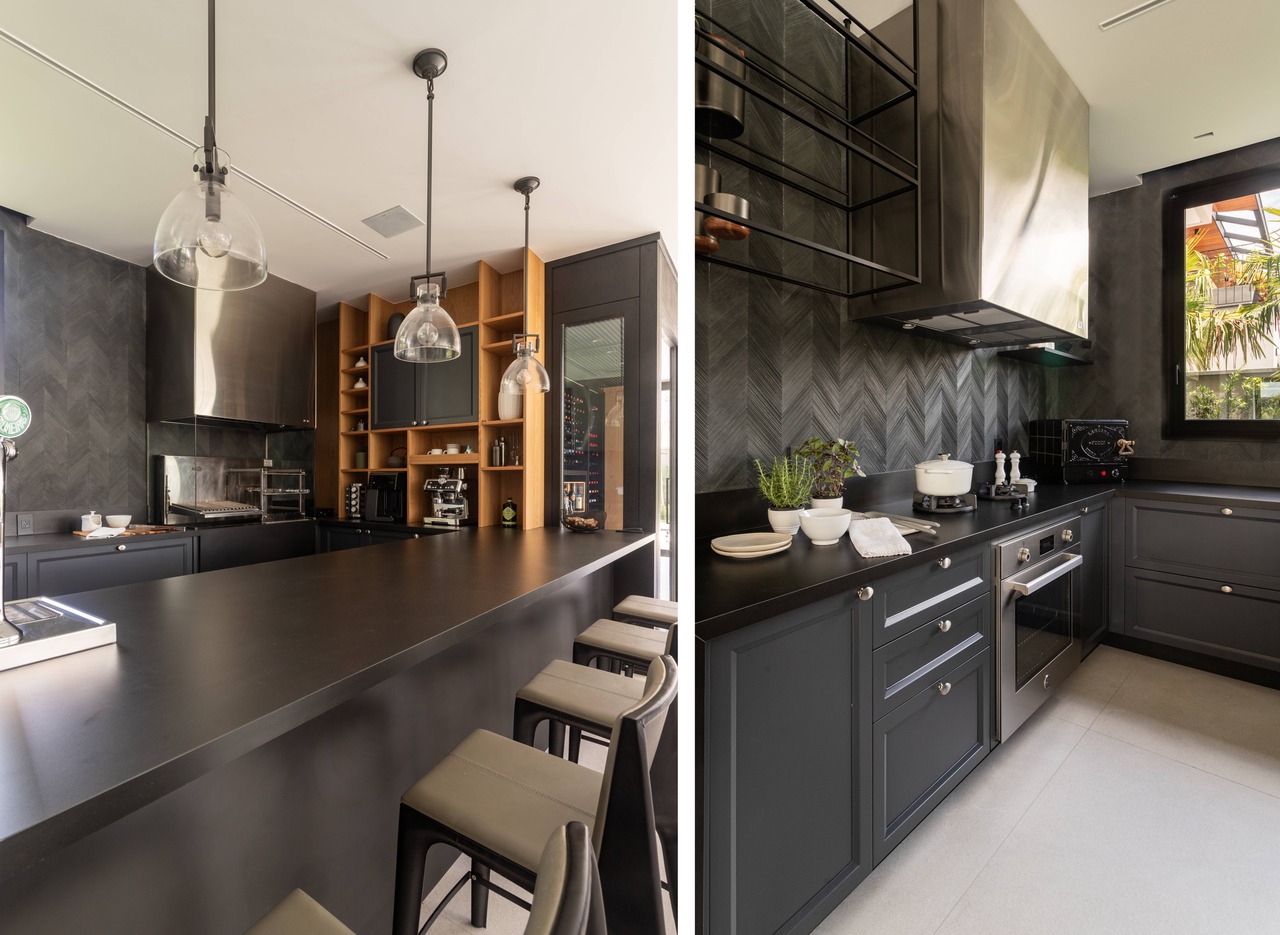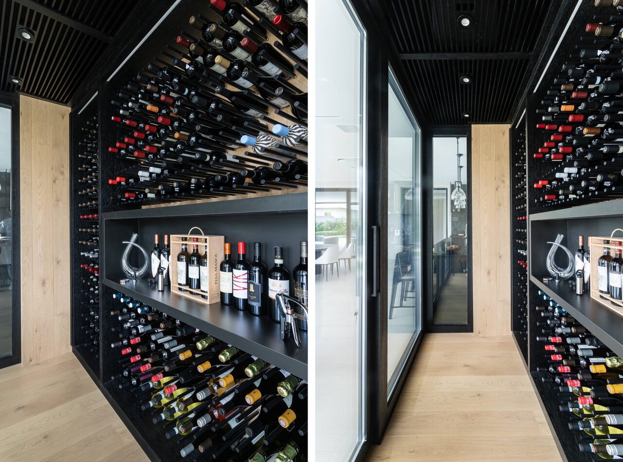 A adega é revestida em madeira ebanizada para acompanhar a lâmina sinterizada das bancadas