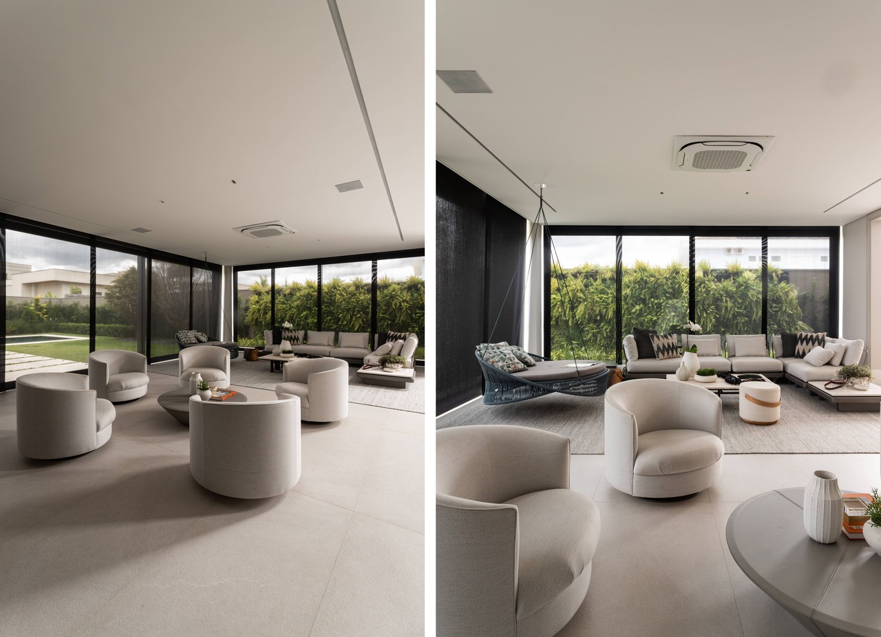 Para delimitar os setores, uma porta de correr foi instalada para assegurar o conforto térmico, uma vez que toda a área social possui ar-condicionado. As esquadrias de vidro garantem que a integração seja mantida visualmente, além da dádiva da luz natural