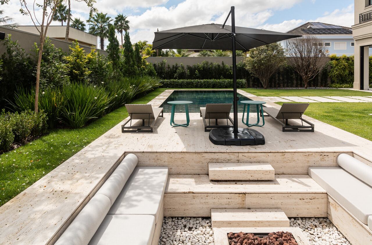 A área da piscina ganhou um trabalho todo especial para que a experiência não fosse restrita aos dias de verão. Um fogo de chão, abaixo do nível da grama, entrega uma atmosfera perfeita para curtir o fim de tarde e noites agradáveis.