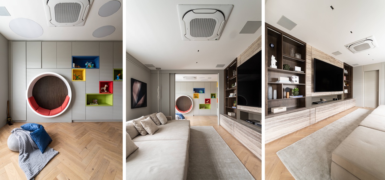 Contígua ao home, unida por uma grande porta de correr, na brinquedoteca os armários embutidos foram ocultados por meio de um painel frisado. No centro desse conjunto, um nicho circular oferece uma área de leitura lúdica, enquanto os demais nichos retangulares e cúbicos foram coloridos com uma paleta diversa