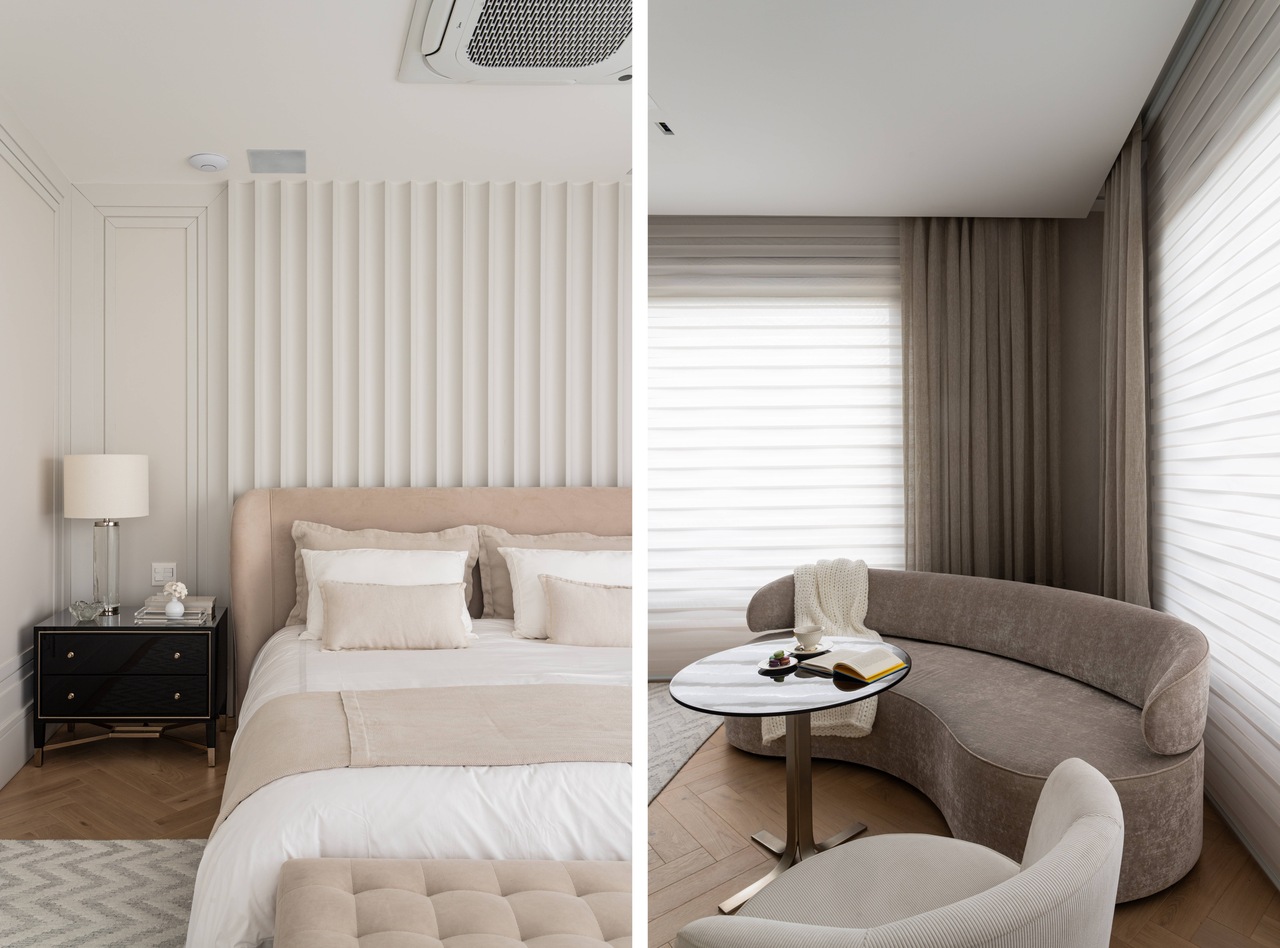 De veludo, a cabeceira foi complementada por um painel canelado curvo e nas laterais a composição ganhou mais um aliado: painéis laqueados e almofadados. Outro charme é a sala íntima recuada e formada por sofá curvo e poltrona