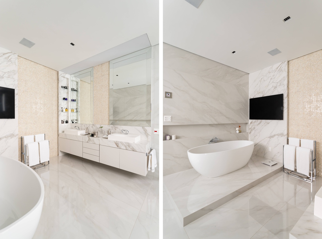 As modernas lâminas sinterizadas revestiram todo o banheiro, inclusive os nichos embutidos na altura da banheira e nas laterais da bancada