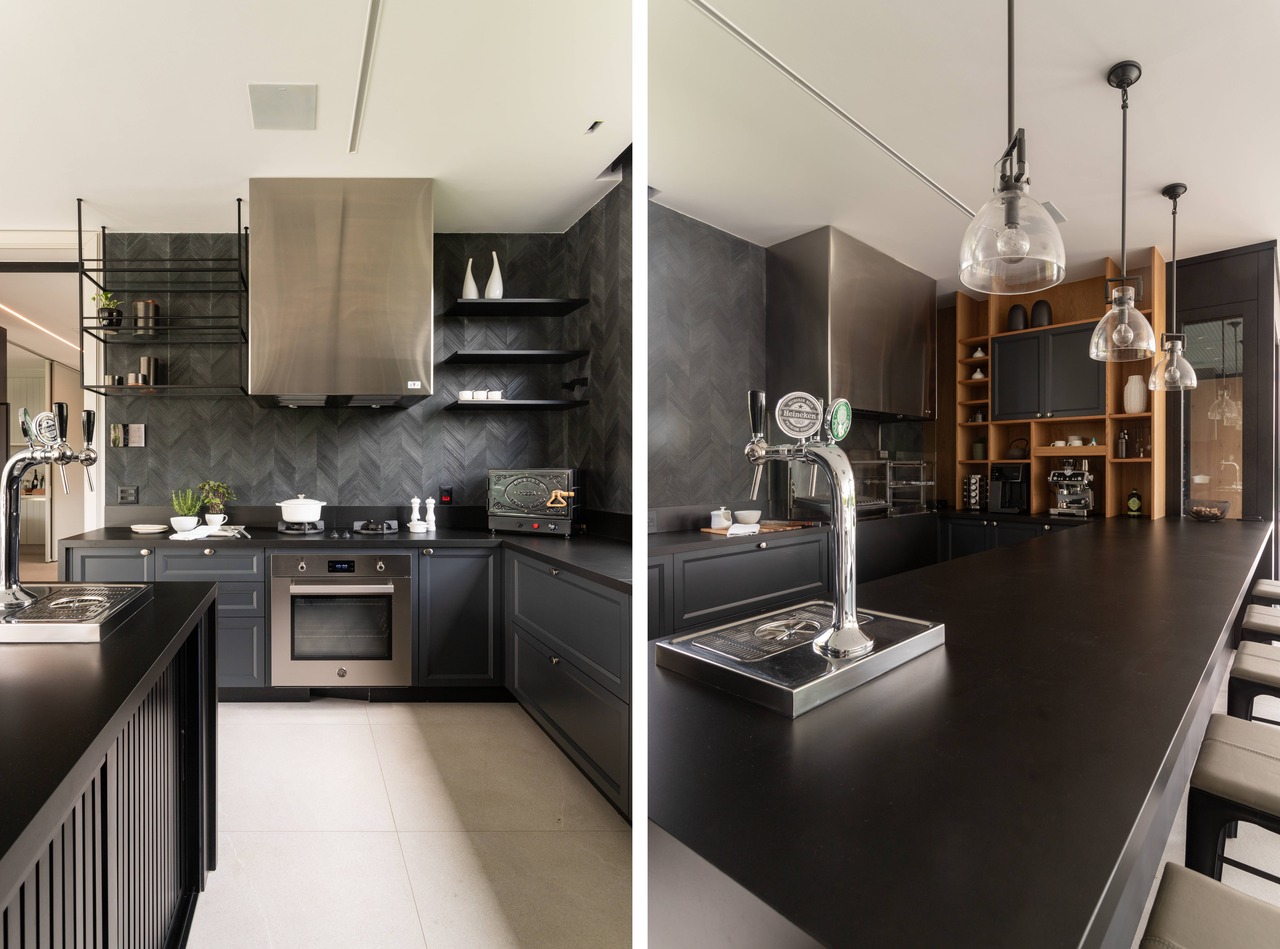 Ainda no setor social, um gourmet completo, trabalhado com os tons de cinza e o preto, trazem uma contemporaneidade junto da marcenaria clássica. Já para as bancadas, a lâmina sinterizada em tom grafite, bem escuro, foi a escolha perfeita para compor o conjunto que conta com “pitt top”, churrasqueira e até uma chopeira. Ao lado, uma porta de correr faz a ligação com a área privativa da cozinha, deixando à disposição a geladeira e a despensa.