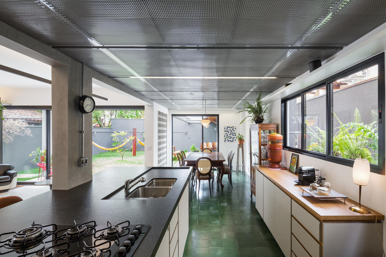 Os materiais utilizados são predominantemente simples e comuns, como o aço, o concreto e a madeira. Um destaque especial é destinado para o forro da cozinha, feito em chapa metálica perfurada que, por sua vez, contém as luminárias embutidas.