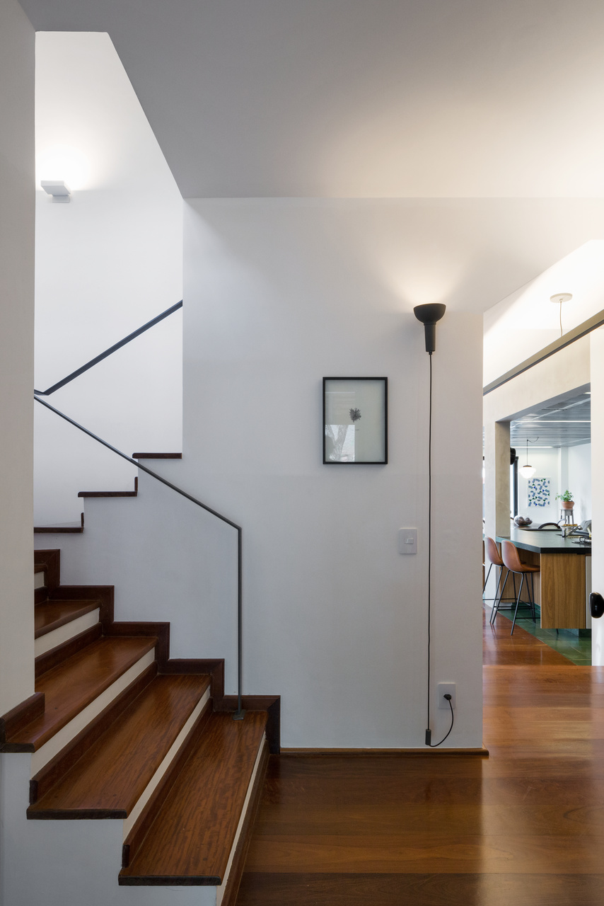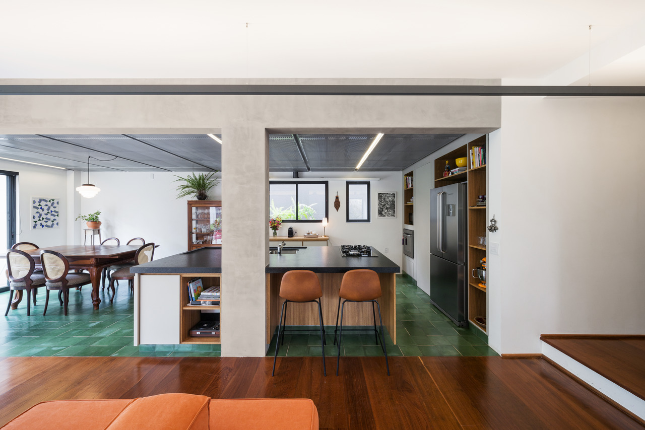 Com aproximadamente 225m² de área construída existente, a primeira intervenção se ocupou da reordenação dos espaços internos, que eliminaram a divisão compartimentada e criaram novas condições de iluminação e ventilação naturais. As demolições internas permitiram dar unidade de espaço e luz, além de proporcionar novas conexões visuais entre o ambiente interno e o jardim nos fundos, que anteriormente contava com uma piscina que ocupava quase toda a área externa.