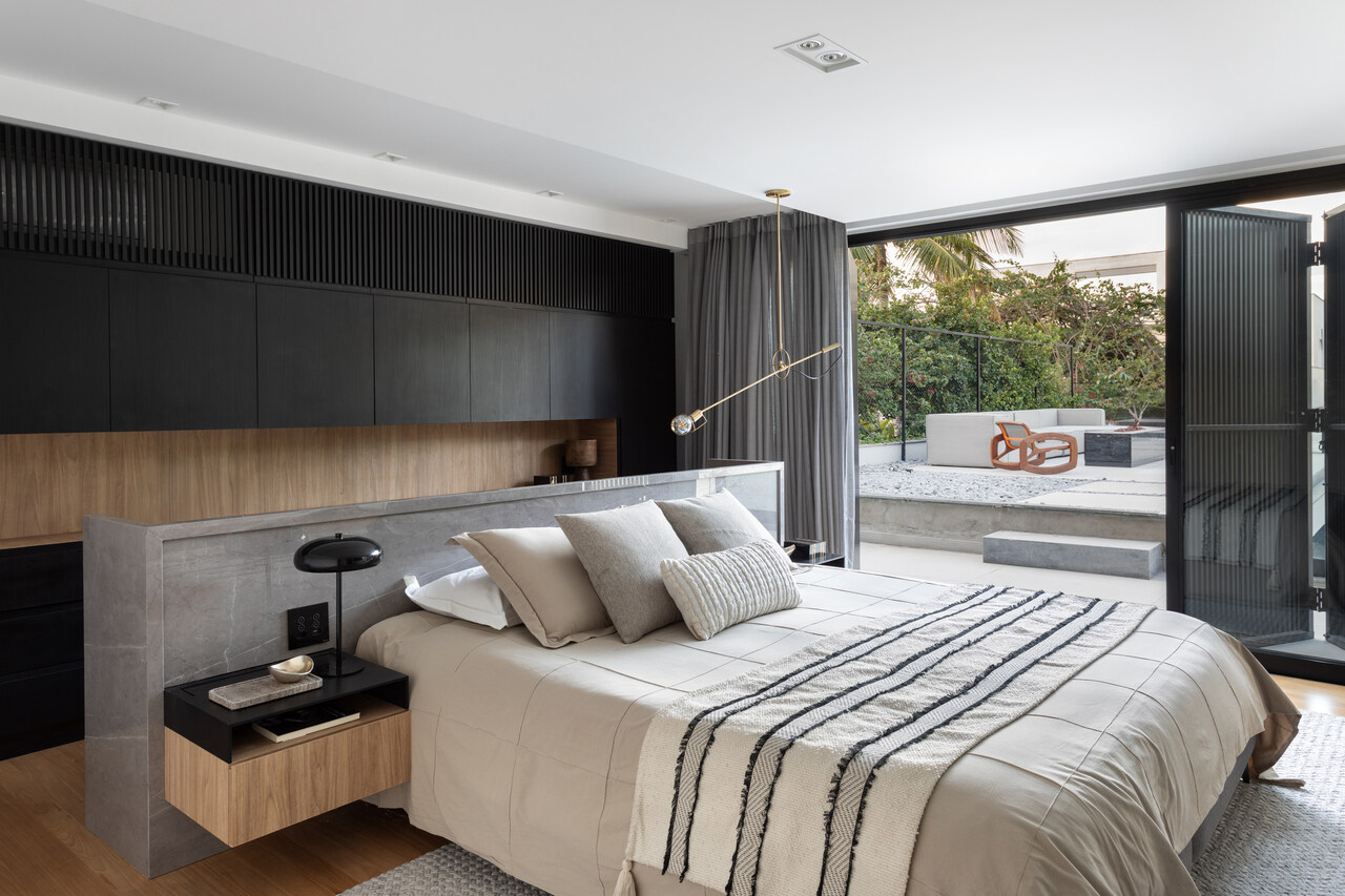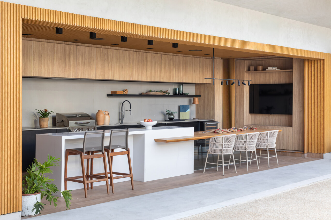 No térreo, a permeabilidade é quase total graças às amplas esquadrias de vidro. Quando abertas, elas eliminam barreiras físicas e transformam os ambientes sociais em uma extensão do espaço externo.