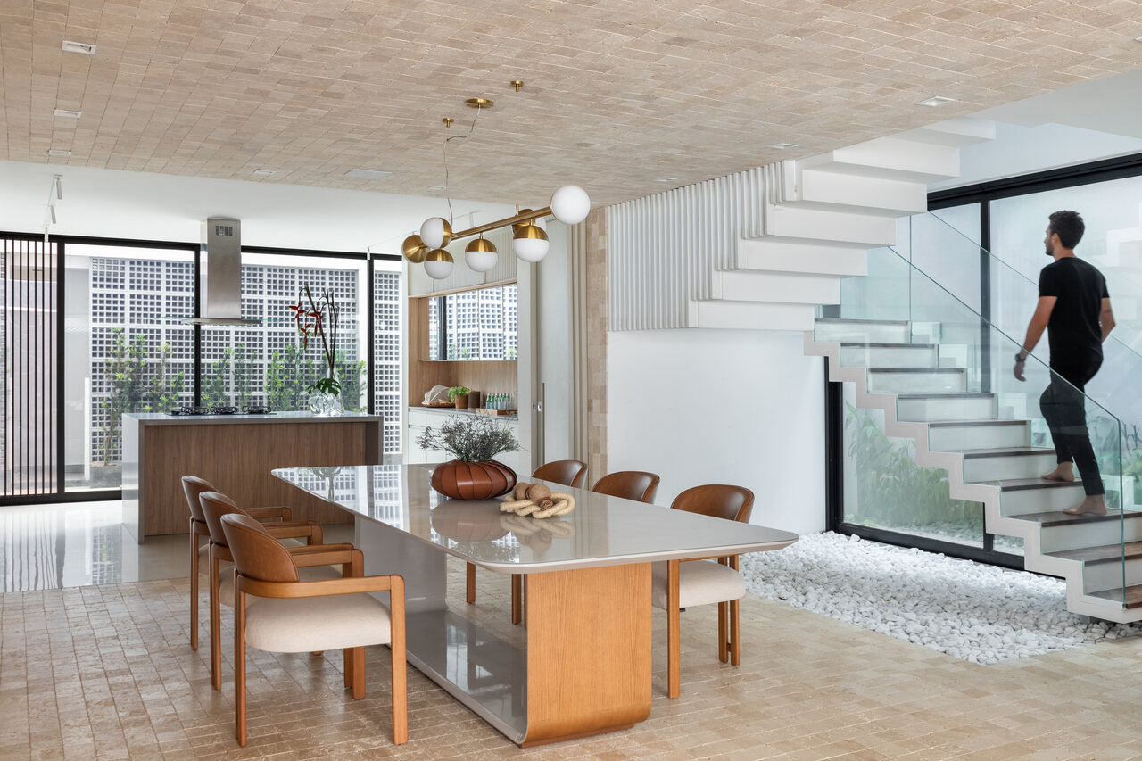 O piso em porcelanato com aparência de cimento queimado se estende pelas áreas internas e externas do térreo, garantindo continuidade visual. Na sala de jantar, o destaque fica para o revestimento integral em lajotinhas de mármore travertino, aplicado em piso, paredes e teto.
