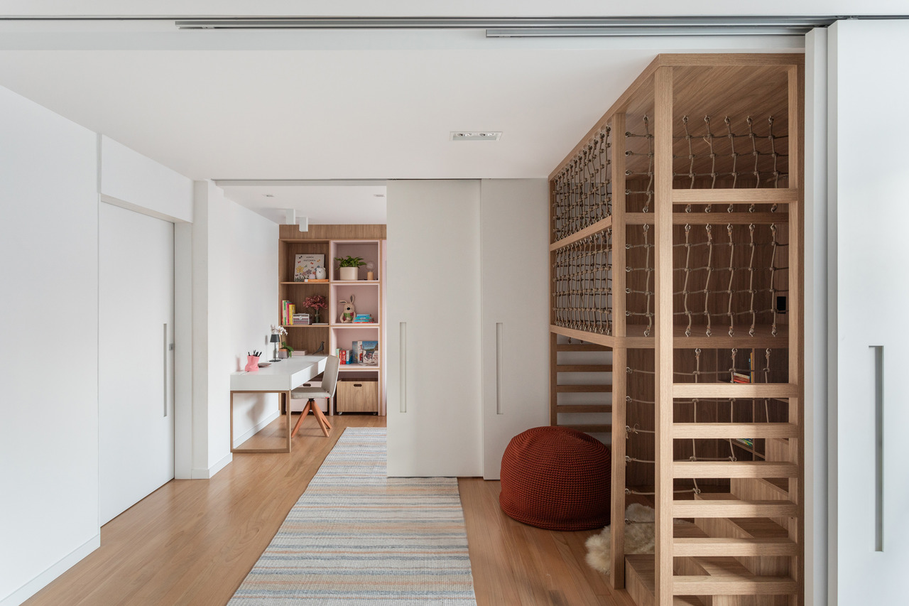 Nos dormitórios, o piso em madeira tauari traz conforto térmico e sensorial. A marcenaria em MDF varia entre tons de madeira clara, ebanizado, branco, rosa claro e verde malva, criando diferentes atmosferas de acordo com cada ambiente.